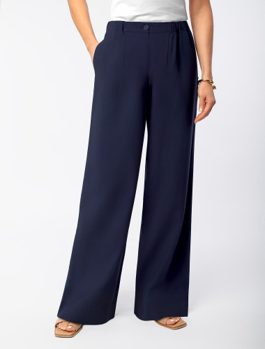 Брюки темно-синего цвета свободного кроя выполнены из плотного лиоцелла. Лиоцелл это более дорогой и экологичный вариант вискозы, очень прочный и шелковистый. Свободные прямые брюки с высокой посадкой визуально вытягивают силуэт и стройнят. Эластичный пояс на мягкой резинке гарантирует комфорт в талии и отлично сядет на любую фигуру. Удобные карманы по бокам и свободный крой делают эти брюки базовым элементом гардероба. Летние брюки отлично сочетаются с монохромным верхом, с ними можно создавать эффектные наряды как на выход, так и для ежедневных рабочих дел или простых прогулок, от делового шика до повседневного кэжуал.