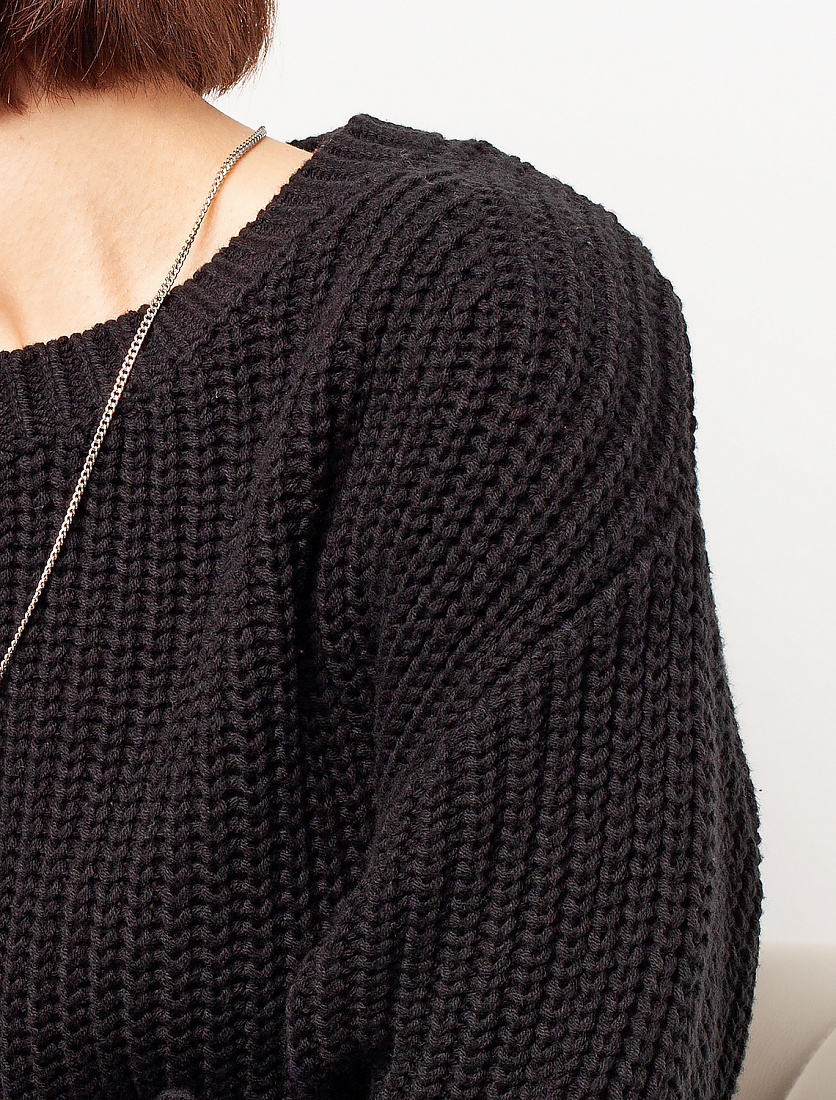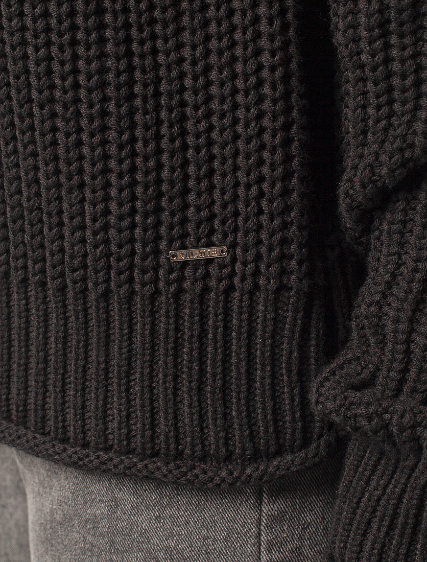 Хлопковый джемпер в матовом черном оттенке. Модель выполнили крупной фактурной вязкой из мягкого хлопка с акрилом. Изделие из такой пряжи получилось невероятно теплым и приятным на ощупь. Подходит для любого типа фигуры и отлично сочетается с низами из денима, эко-кожи и классическими брюками.