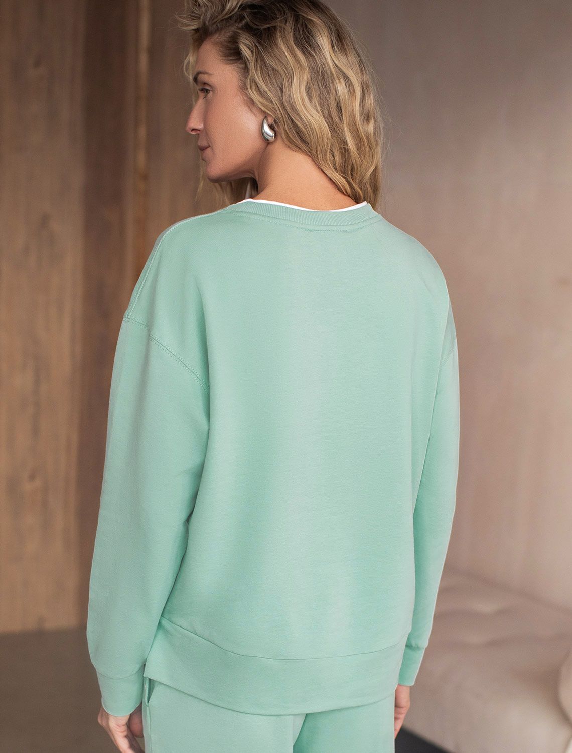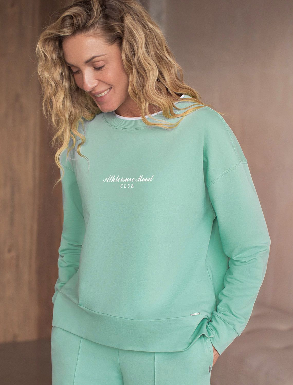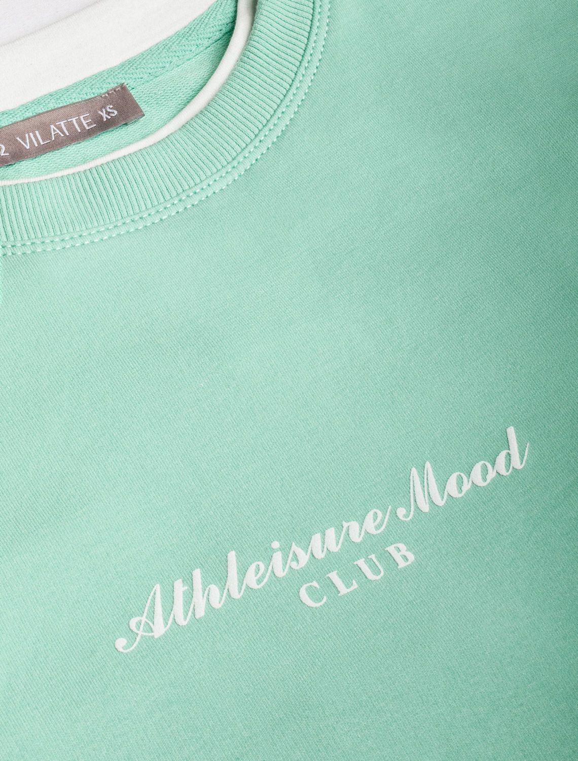 Стильный свитшот мятного цвета из премиального футера двухнитки с эластаном сочетает в себе комфорт и оригинальность. Джемпер выполнен из натурального хлопка, который обеспечивает мягкость и дышащие свойства ткани. Нежный материал дарит ощущение уюта в любое время года, а премиальное качество изготовления гарантирует долговечность и сохранение формы после множества стирок. Особенность изделия — спущенная линия плеча и аккуратные разрезы, которые добавляют современный акцент и делают образ более выразительным. Эффект имитации футболки в виде белой отделки на вороте делает дизайн динамичным и повышает градус стиля. Принт в виде надписи придает индивидуальность, позволяя выделиться без лишней вычурности. Перевод надписи Athleisure mood club - Клуб спортивного настроения. Дополнен металлическим логотипом бренда. Представлена широкая размерная линейка, включая маленькие и большие размеры, что позволяет подобрать идеальный вариант для разной фигуры и роста. Этот уютный свитшот отлично подходит для повседневной носки благодаря своей комфортной посадке и мягкой текстуре. Он станет универсальным элементом гардероба, легко сочетающимся с различными стилями одежды. Свободный джемпер из футера станет отличным выбором для активного отдыха, обеспечивая стильный внешний вид и удобство весной, летом или в прохладную погоду.