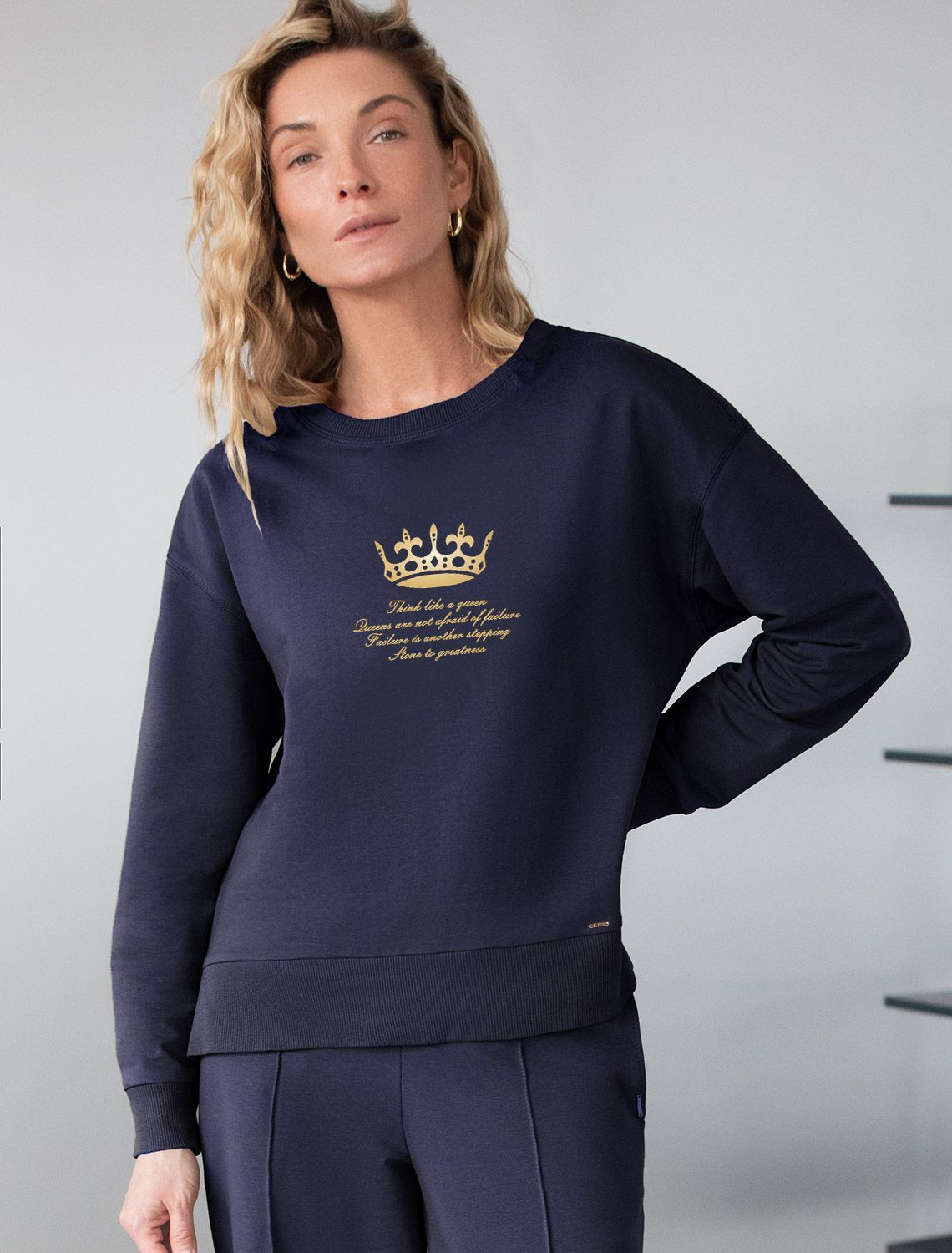 Стильный свитшот темно-синего цвета из премиального футера двухнитки с эластаном сочетает в себе комфорт и оригинальность. Джемпер выполнен из натурального хлопка, который обеспечивает мягкость и дышащие свойства ткани. Нежный материал дарит ощущение уюта в любое время года, а премиальное качество изготовления гарантирует долговечность и сохранение формы после множества стирок. Особенность изделия — спущенная линия плеча и аккуратные разрезы, которые добавляют современный акцент и делают образ более выразительным. Принт в виде надписи придает индивидуальность, позволяя выделиться без лишней вычурности. Перевод надписиThink like queen Queens are not afraid of failure Failure is another stepping Stone to greatness - Думай как королева Королевы не боятся неудач Неудача — это ещё один шаг К величию. Дополнен металлическим логотипом бренда. Представлена широкая размерная линейка, включая маленькие и большие размеры, что позволяет подобрать идеальный вариант для разной фигуры и роста. Этот уютный свитшот отлично подходит для повседневной носки благодаря своей комфортной посадке и мягкой текстуре. Он станет универсальным элементом гардероба, легко сочетающимся с различными стилями одежды. Свободный джемпер из футера станет отличным выбором для активного отдыха, обеспечивая стильный внешний вид и удобство весной, летом или в прохладную погоду.