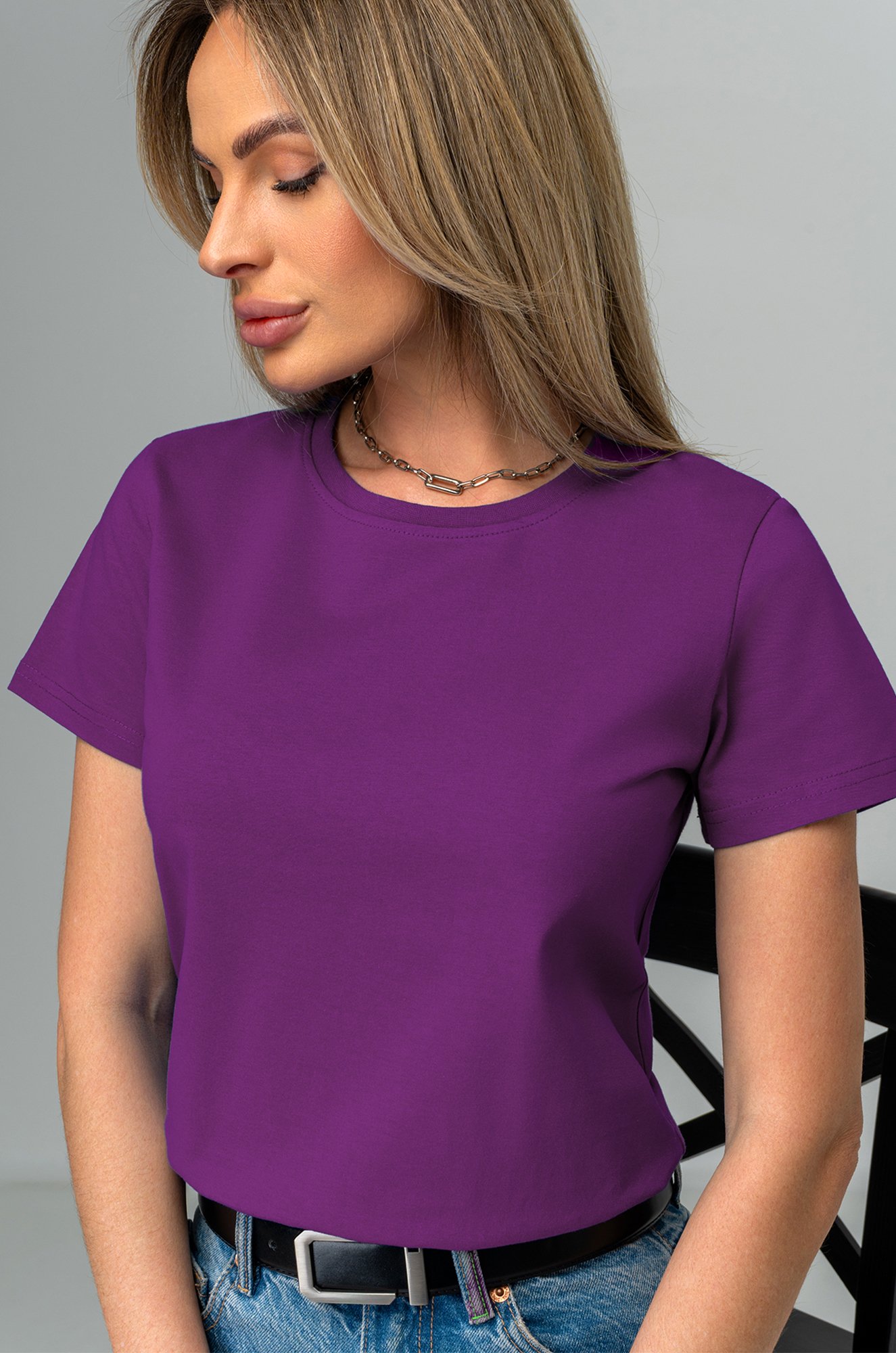 Женская базовая футболка станет незаменимой частью капсульного гардероба. Классическая футболка выполнена из 100% хлопка. Фиолетовая футболка — идеальный выбор для тех, кто ценит стиль, комфорт и простоту в каждой детали. Однотонная футболка сливового цвета — прекрасная база на лето.