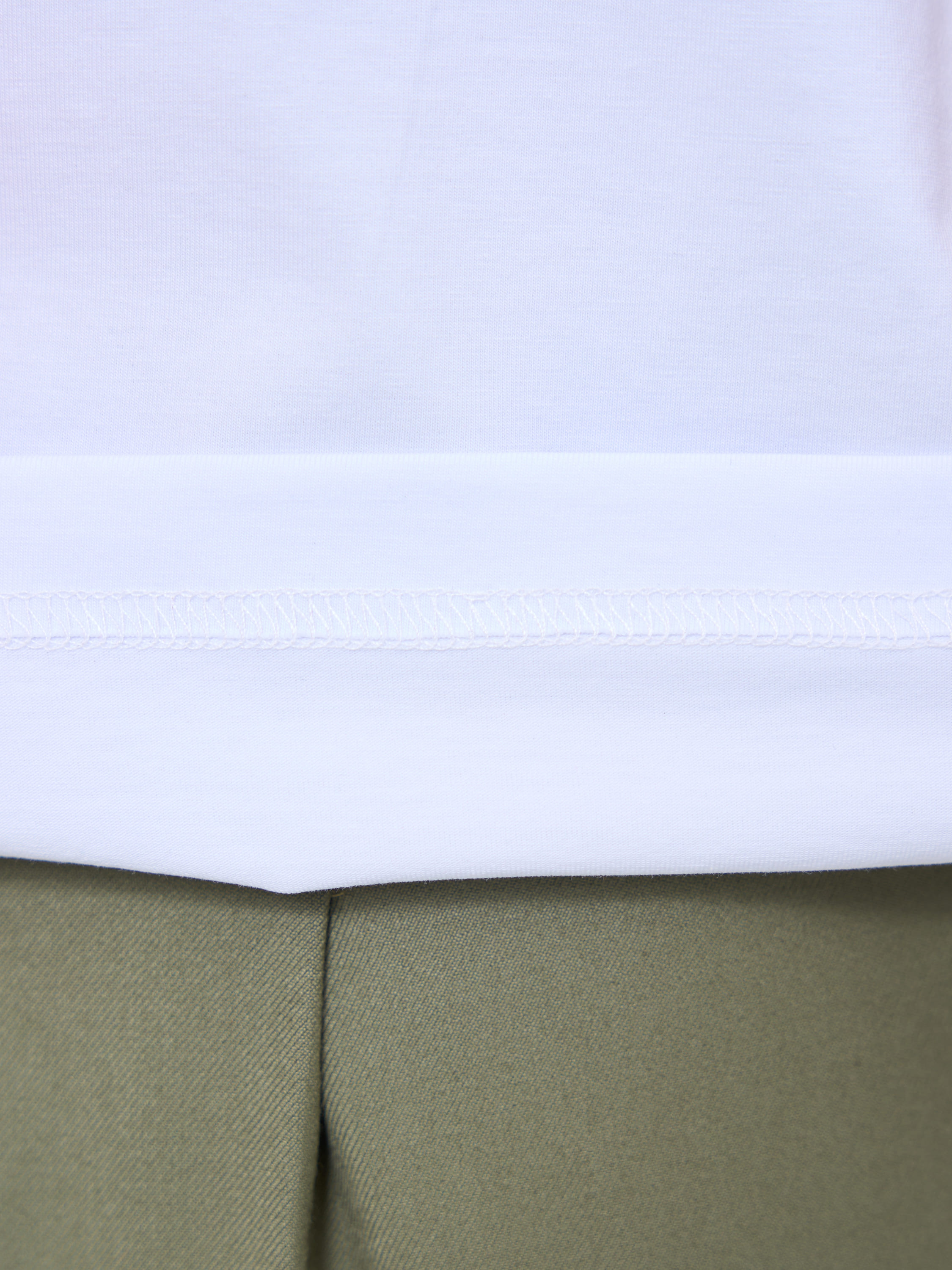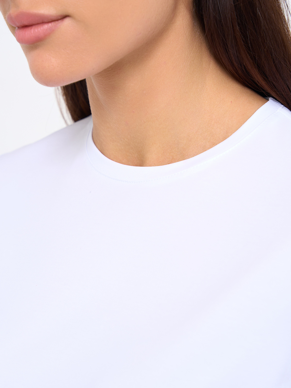 Цвет: Белый Рисунок: Без рисунка<..показать/li> Состав: 95% хлопок 5% эластан Модель: Прямая Ворот: Круглый Караман: отсутствует Силуэт: Прямой силуэт / Сlassic fit/li>