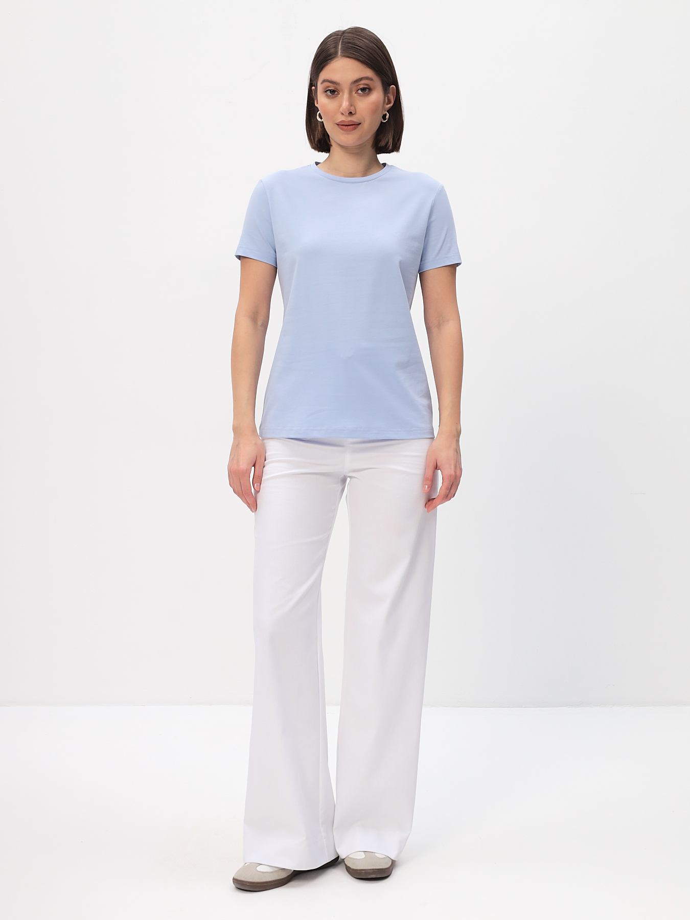 Цвет: Голубой Рисунок: Без рисунк..показатьа Состав: 95% хлопок 5% эластан Модель: Прямая Ворот: Круглый Караман: отсутствует Силуэт: Прямой силуэт / Сlassic fitа