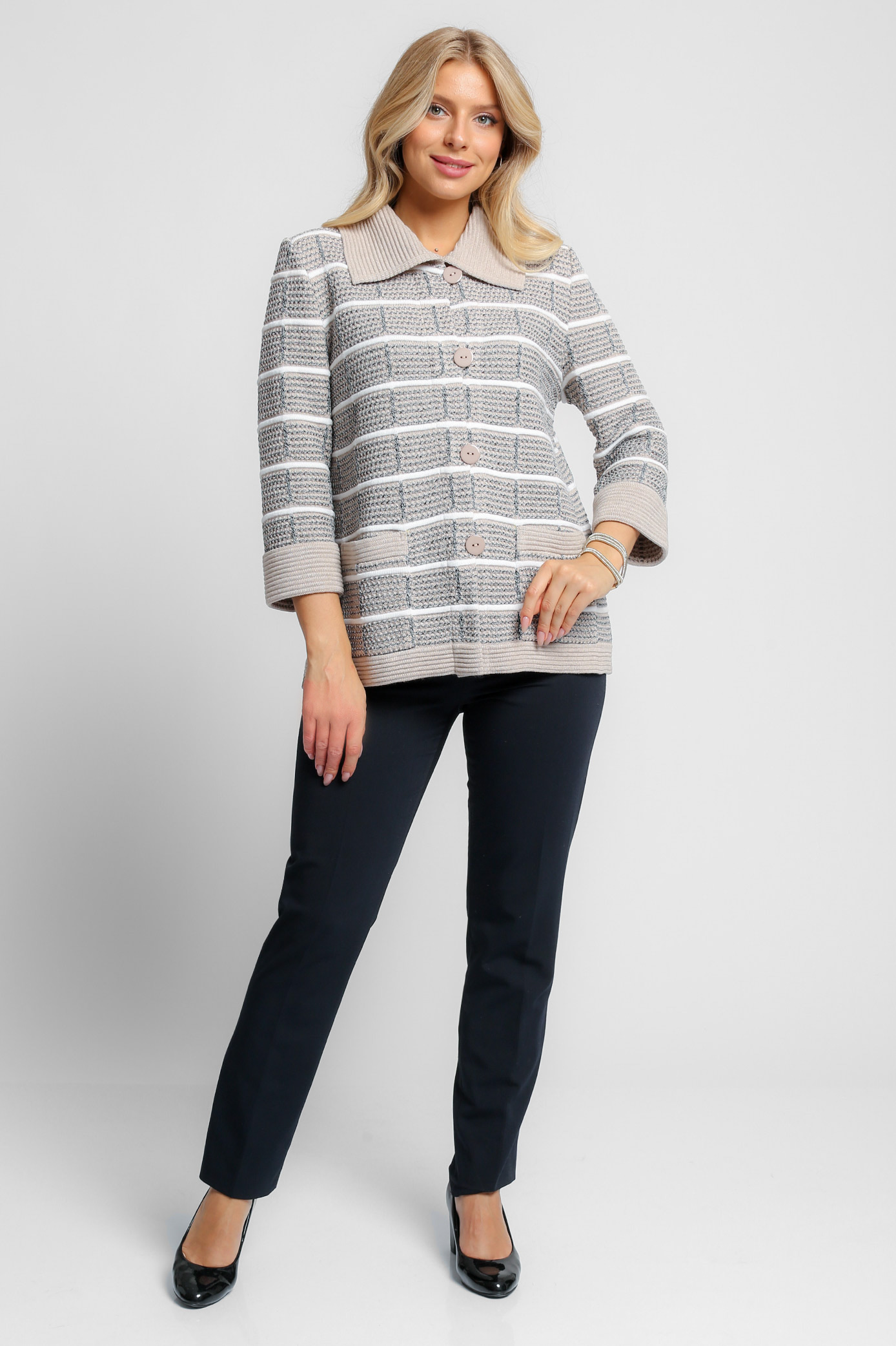 Вязаный женский жакет свободного силуэта с рубашечным отложным воротником.  Рукав втачной длиной 7/8 с отворотом.  По бокам два накладных кармана с листочкой. Жакет застегивается на пуговицы с навесной петлей. Изделие выполнено жаккардовым переплетением  образующим валики. бежевый
