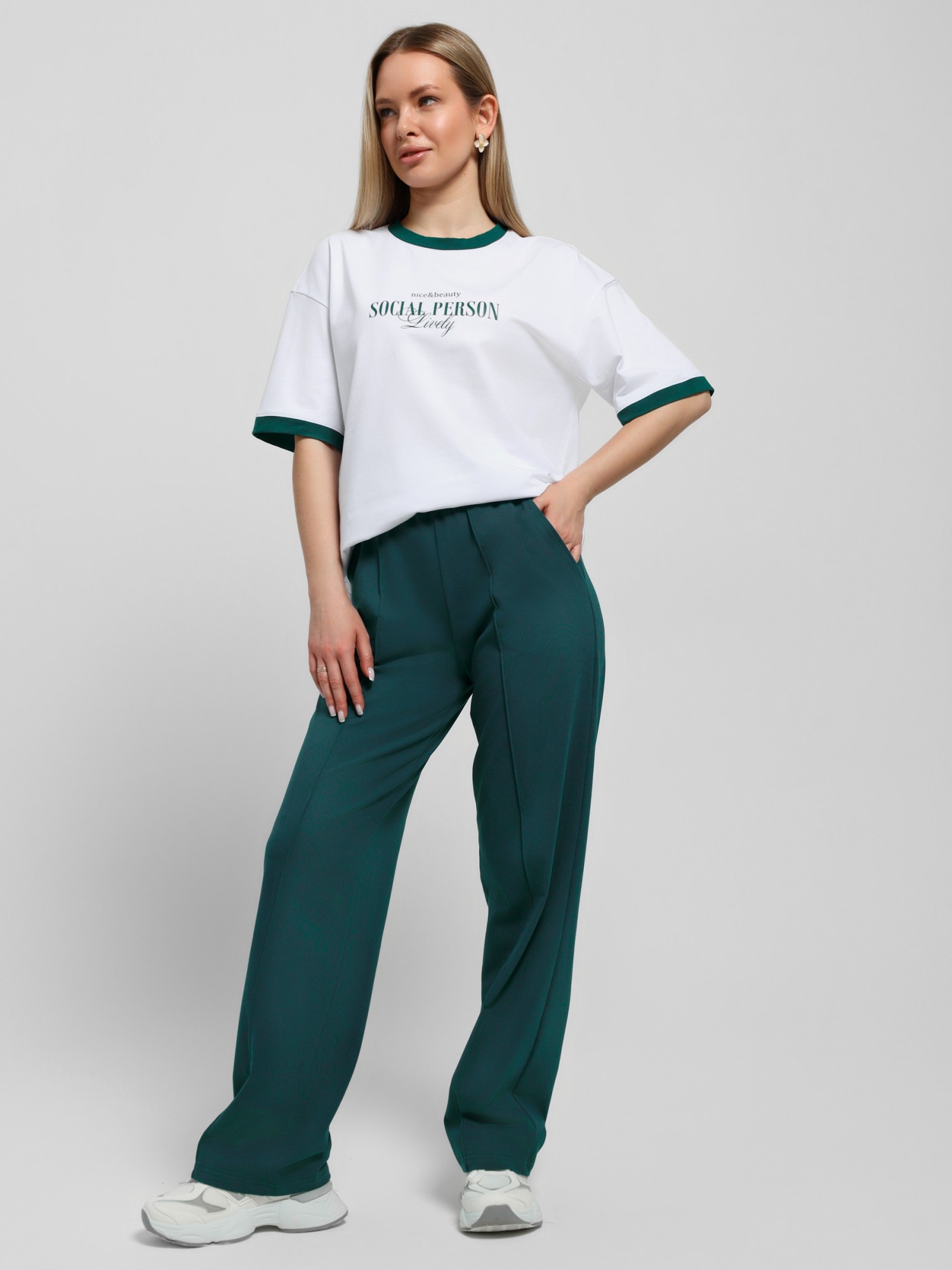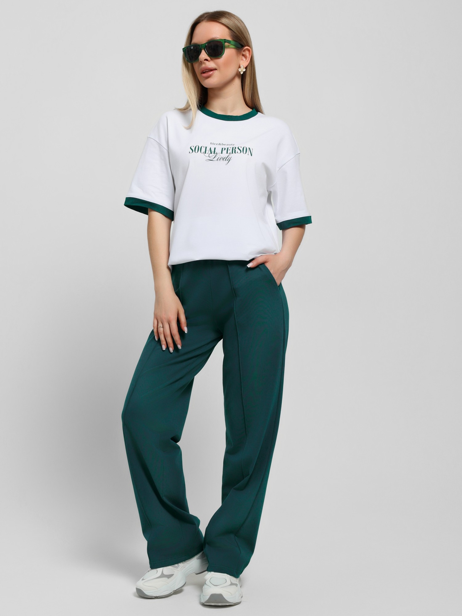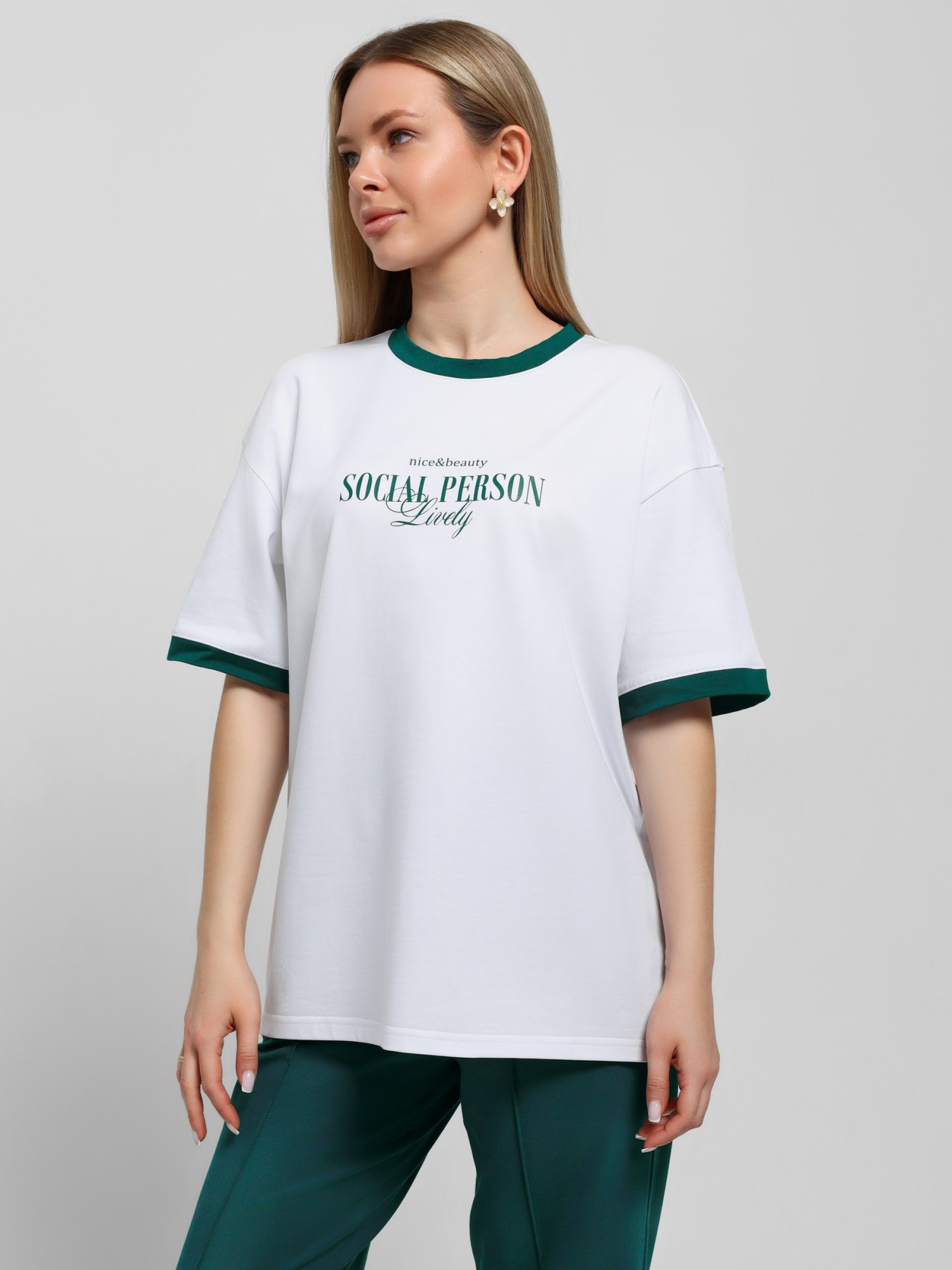 Футболка молодежная из трикотажного полотна «кулирка с лайкрой» свободного покроя, горловиной овальной формы, короткими втачными рукавами. Планка горловины и манжеты на рукавах выполнены из контрастного материала, на полочке принт, выполненный в технике «шелкографии».