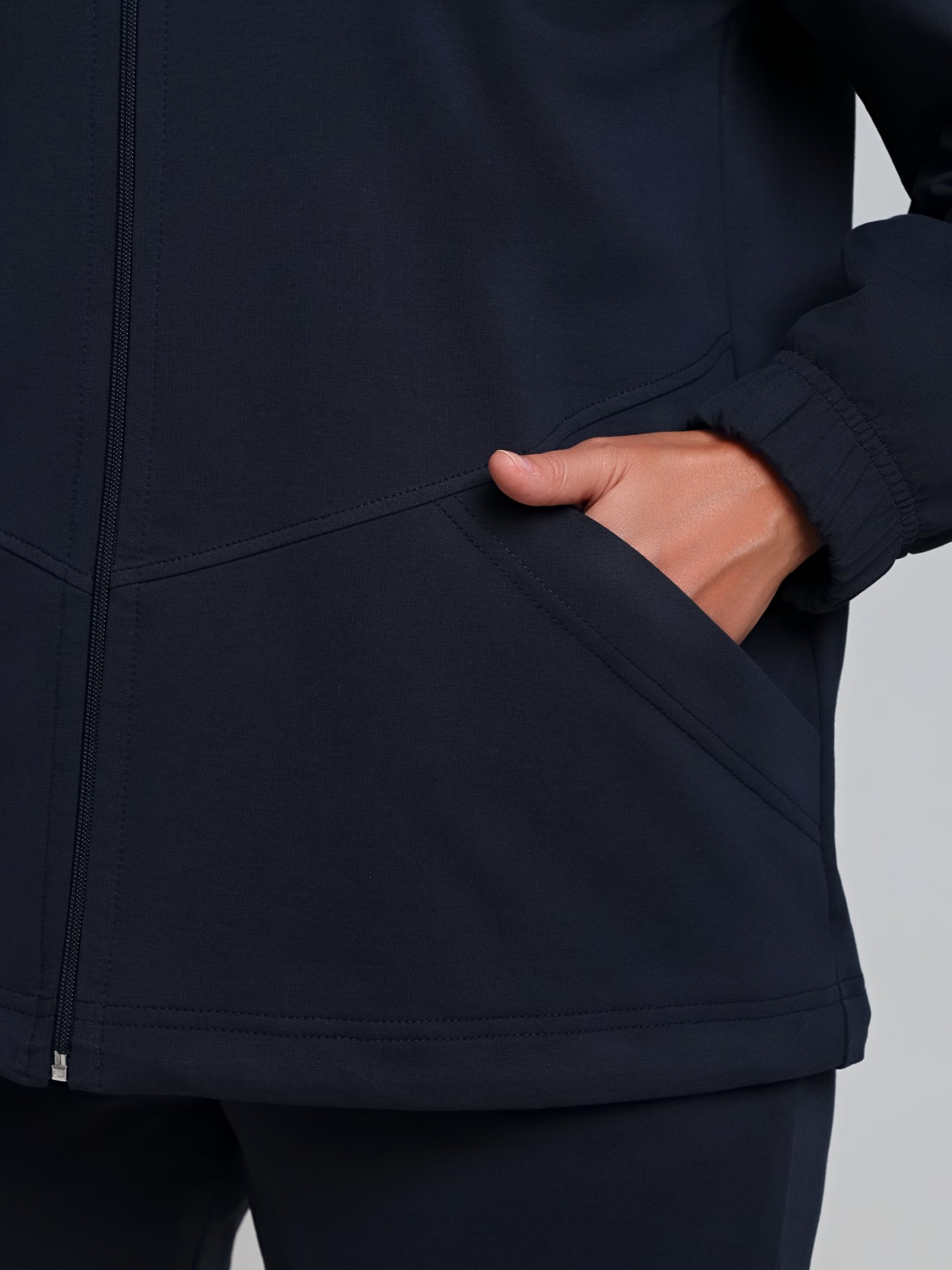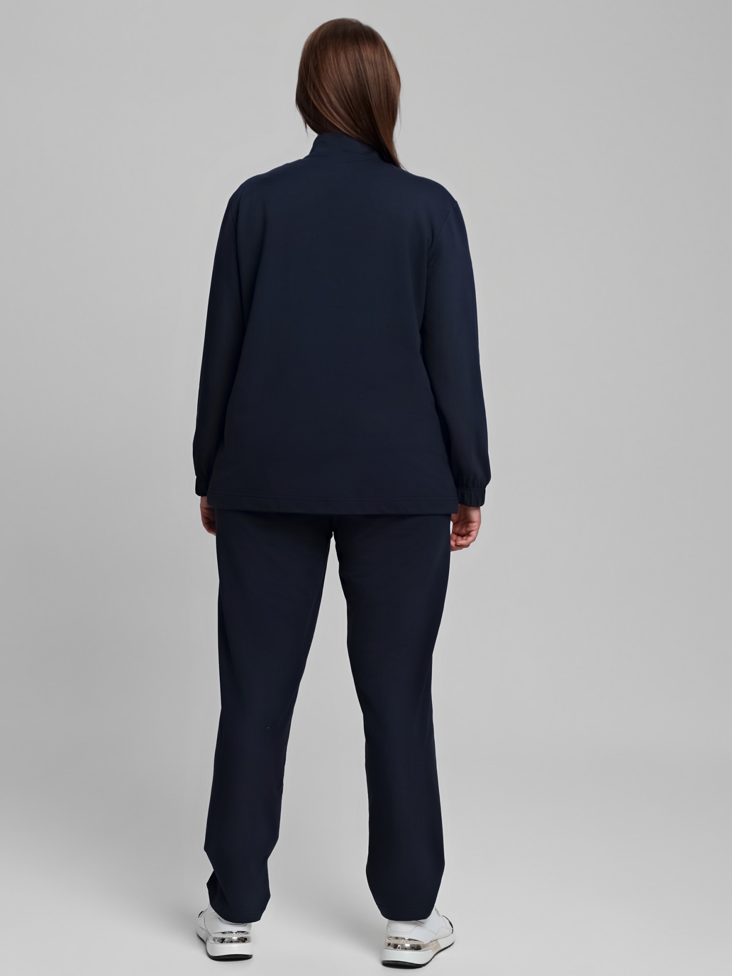 Костюм женский из трикотажного полотна «футер-двунитка» в единой цветовой гамме, состоящий из куртки и брюк. Куртка - прямого силуэта, свободная с длинными втачными рукавами, воротником «стойкой». Полочка состоит из двух частей соединенных по-косой, с накладными карманами и центральной бортовой застежкой на тесьму «молния». Низ рукавов обработан эластичной тесьмой, низ изделия с подгибкой с вложение эластичной тесьмы и регулируется по длине с помощью фиксаторов.Брюки - длинные, классического покроя, на притачном поясе с эластичной тесьмой внутри и карманами в боковых шва, на задних половинах обработаны две вытачки в области линии талии.