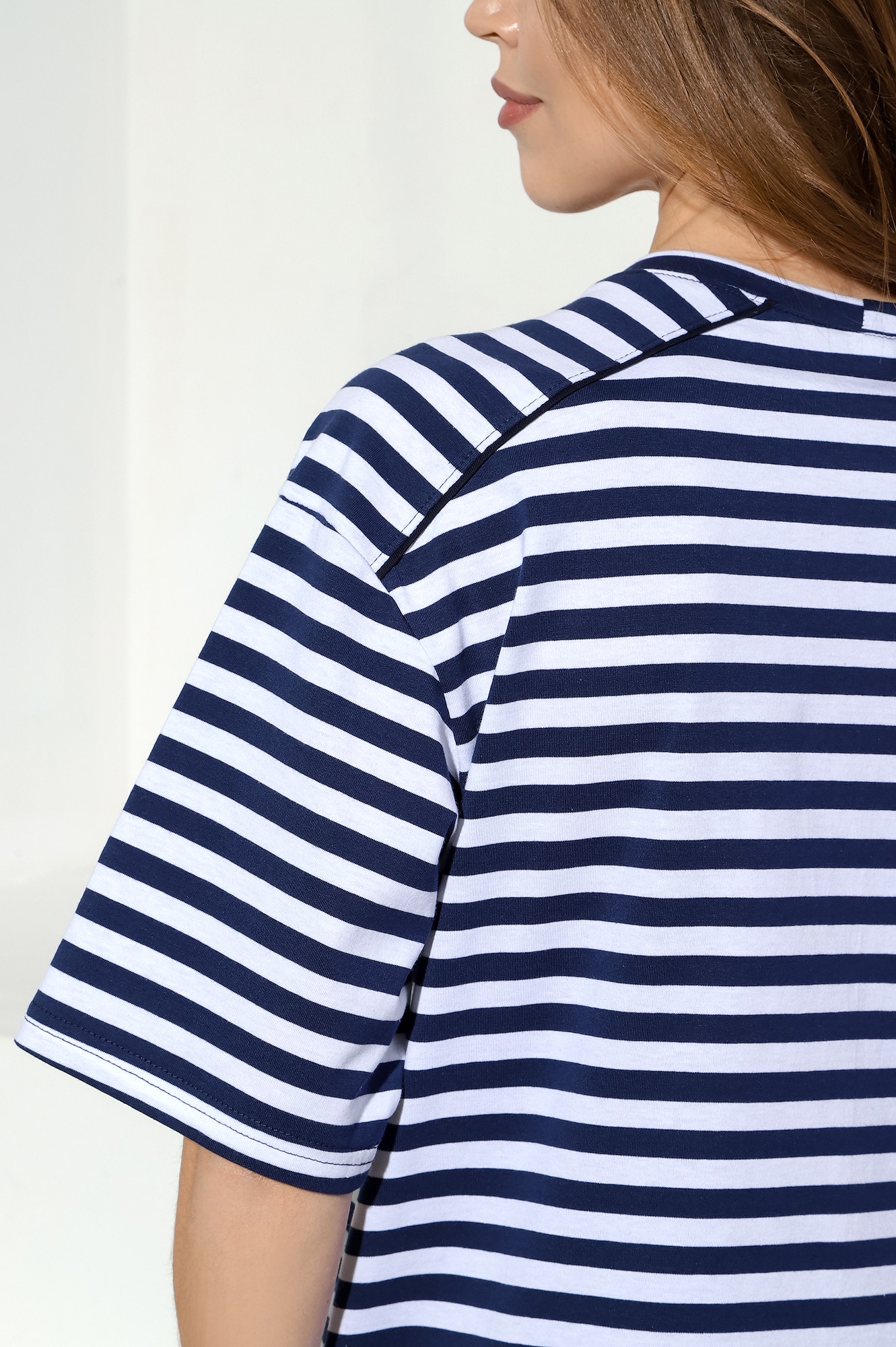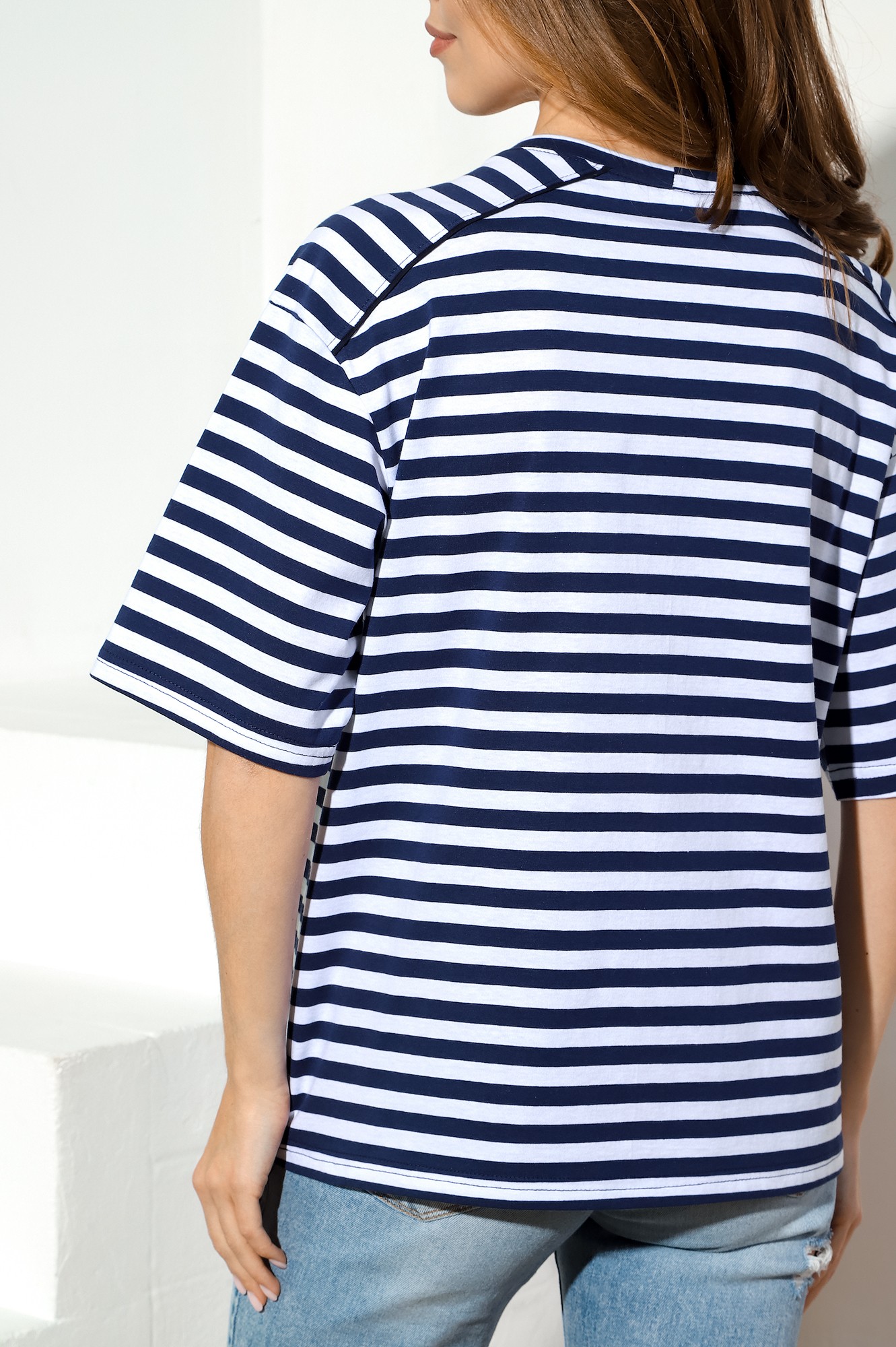 Футболка молодежная их трикотажного полотна кулирка» в полоску, свободная, с втачными рукавами, горловиной овальной формы, обработанной притачной бейкой из основного материала. Полочка и спинка с двумя небольшими косыми кокетками и отделочным кантом в швах соединения кокеток с основными деталями, кант из контрастного материала.