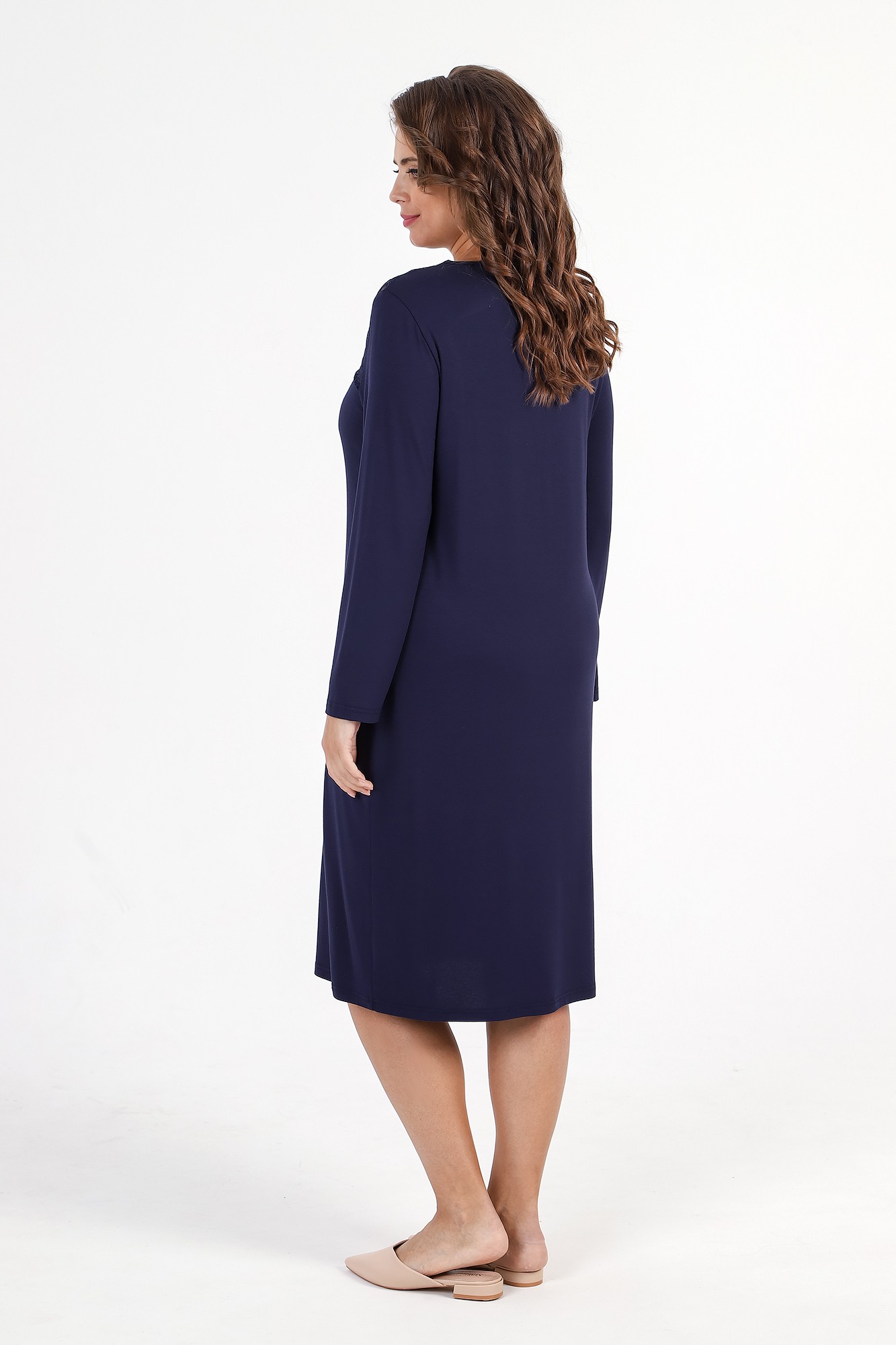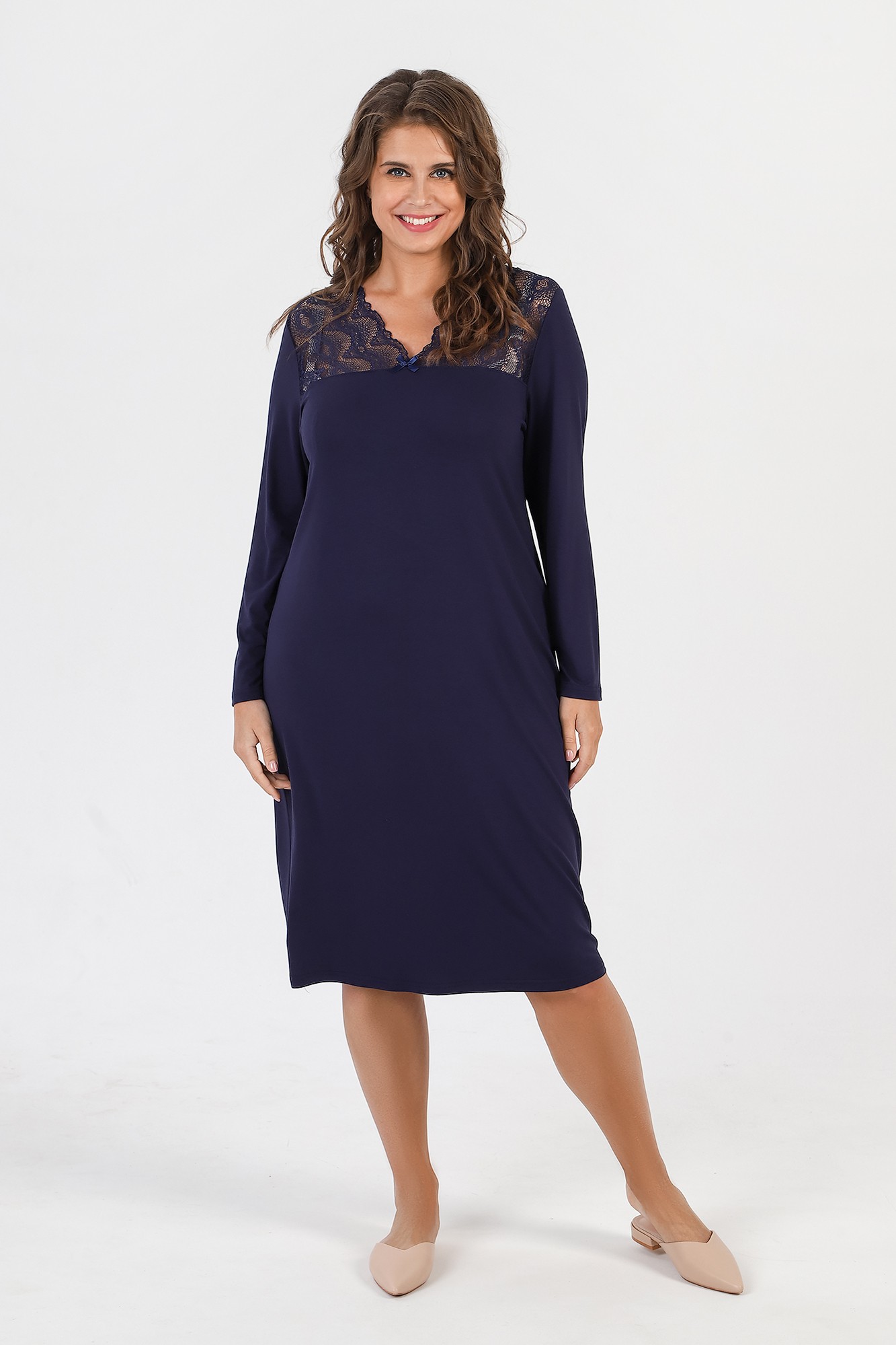 Сорочка женская из гладкокрашеного трикотажного вискозного полотна, прямого силуэта, с длинными втачными рукавами и горловиной V-образной формы. Перед с притачной кружевной кокеткой и декоративным бантиком из узкой атласной ленты в центре соединительного шва.