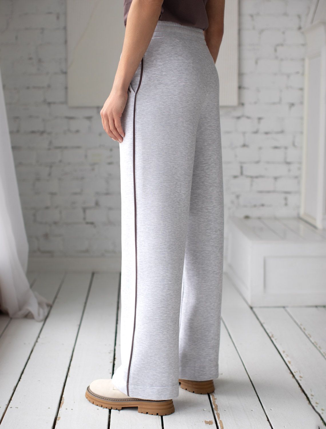 Теплые прямые брюки серого цвета с эффектом меланж из эластичного футера трехнитки с начесом созданы для максимального комфорта в холодную погоду. Мягкий материал приятный к телу, хорошо держит форму, не вытягивается и не теряет форму даже при активной носке. Благодаря дышащим свойствам премиального футера, брюки подходят на любую погоду, обеспечивая оптимальный микроклимат и уют. Свободный крой и эластичный широкий пояс делает посадку удобной для разных типов фигуры и размеров, включая большие и маленькие. Застроченные стрелки визуально вытягиват силуэт и подчеркивают эстетичнось повседневных брюк, а контрастные тонкие лампасы добавляют актуальности образу. Благодаря особенностям трехниточного плетения и внутреннему слою с начесом, эти брюки отлично сохраняют тепло в холодные осенние и зимние дни, при этом в них вы будете выглядеть модно и современно. Вы можете составить комплект с артикулами: D49.143 и D49.142