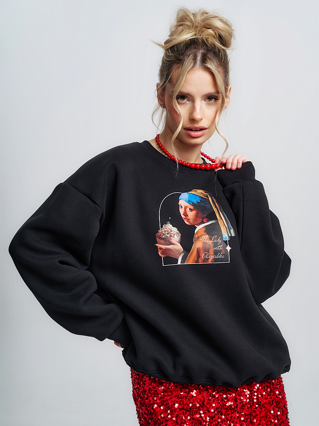 Вдохновленная известной картиной, модель с изысканным принтом и юмористической надписью «Леди с оливьешкой» объединяет классическое искусство и современную моду. Свитшот свободного силуэта с круглой горловиной и длинными рукавами на эластичных манжетах обеспечивает комфорт и тепло в прохладные дни.