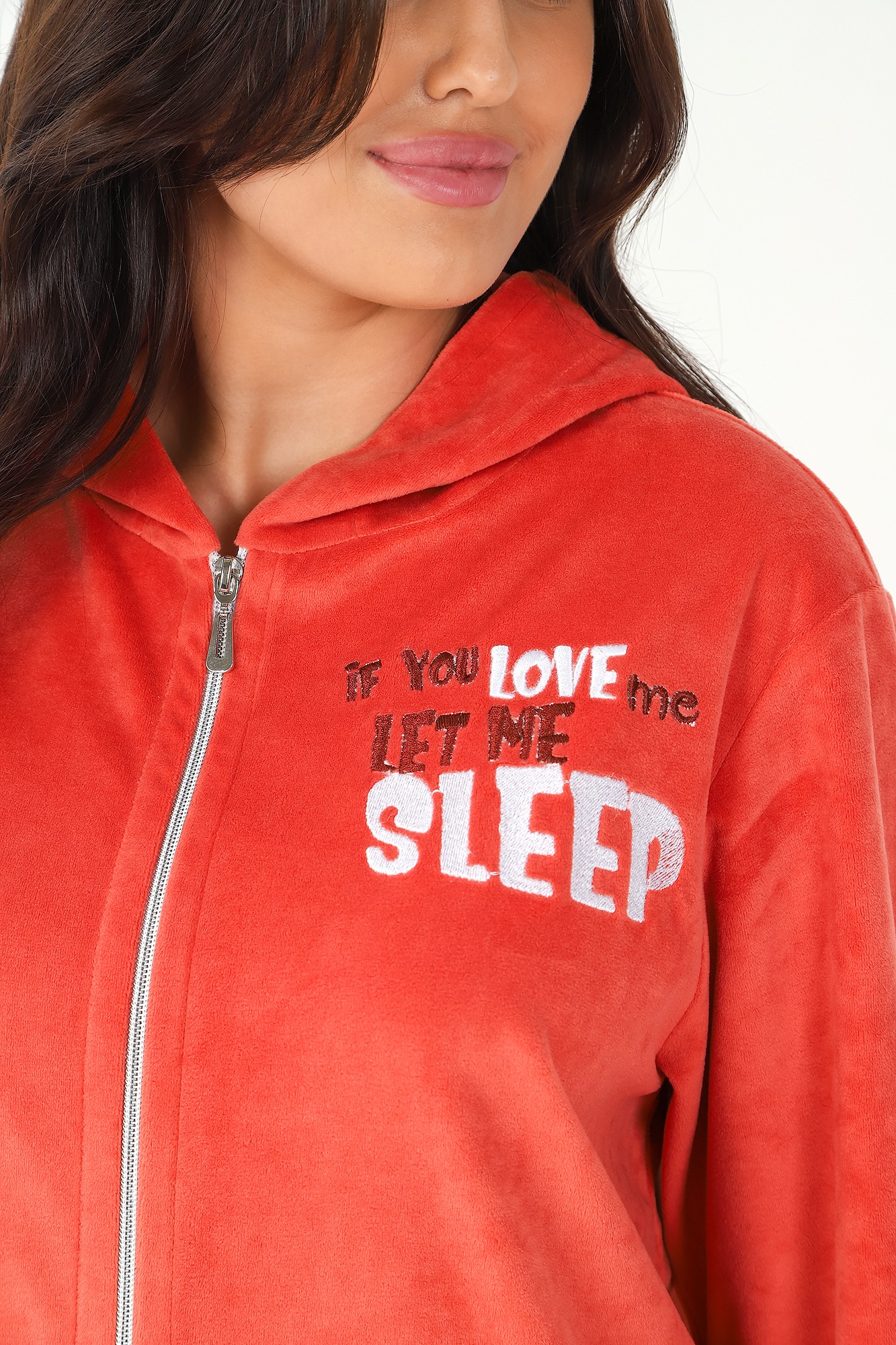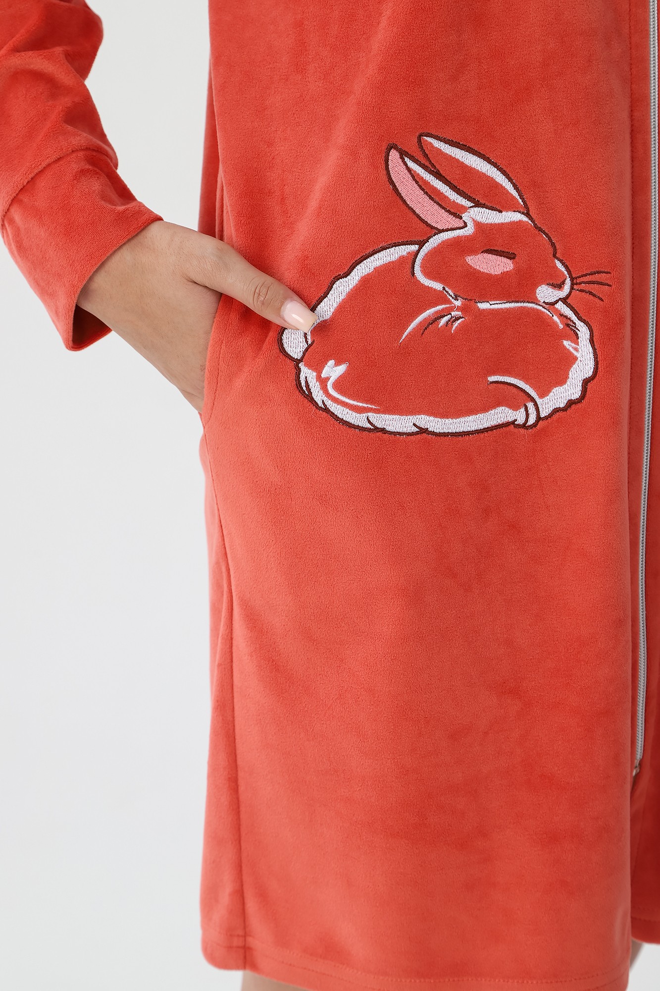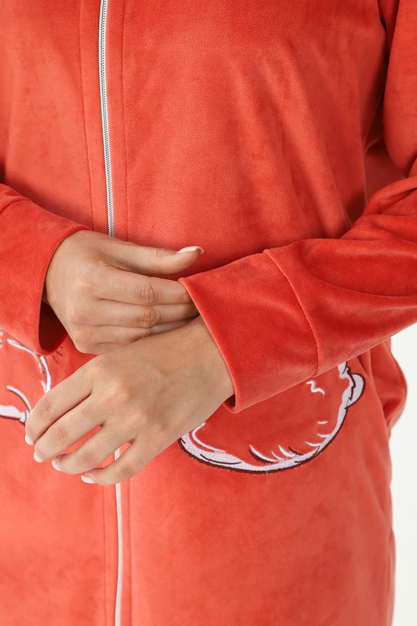 Халат молодежный из трикотажного полотна «вельмонд», прямого силуэта, с длинными втачными рукавами, капюшоном, карманами в боковых швах, и центральной бортовой застежкой на тесьму «молния». В области карманов и в верхней части левой полочки выполнена вышивка – аппликация.