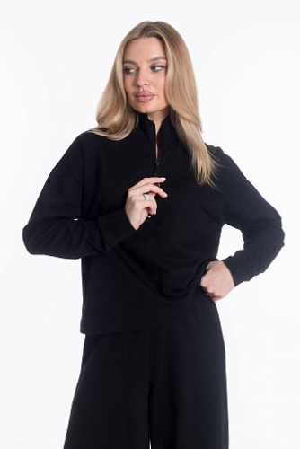 Женская толстовка из облегченного футера 2х нитки — отличный выбор для повседневной носки. Модель со спущенной проймой и притачной манжетой на рукаве обеспечивает свободу движений. Воротник-стойка и застёжка на молнию на горловине добавляют изделию элегантность. Однотонная черная толстовка идеально подойдёт для активного отдыха или прогулок.