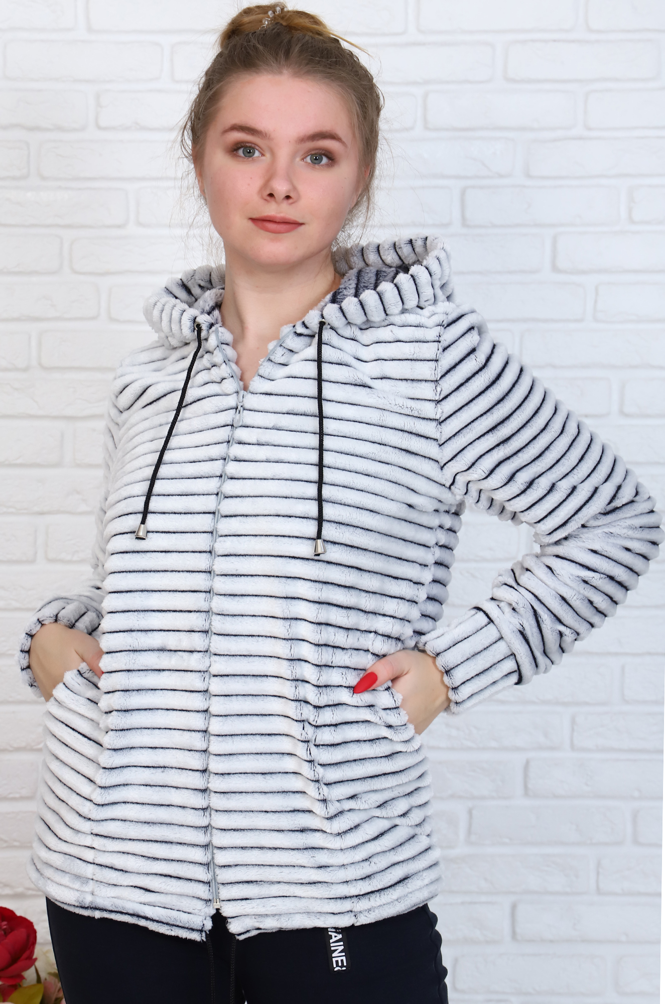 Мягкая, уютная и тёплая толстовка с капюшоном. Модель на молнии, по бокам карманы, снизу затягивается на кулиску.