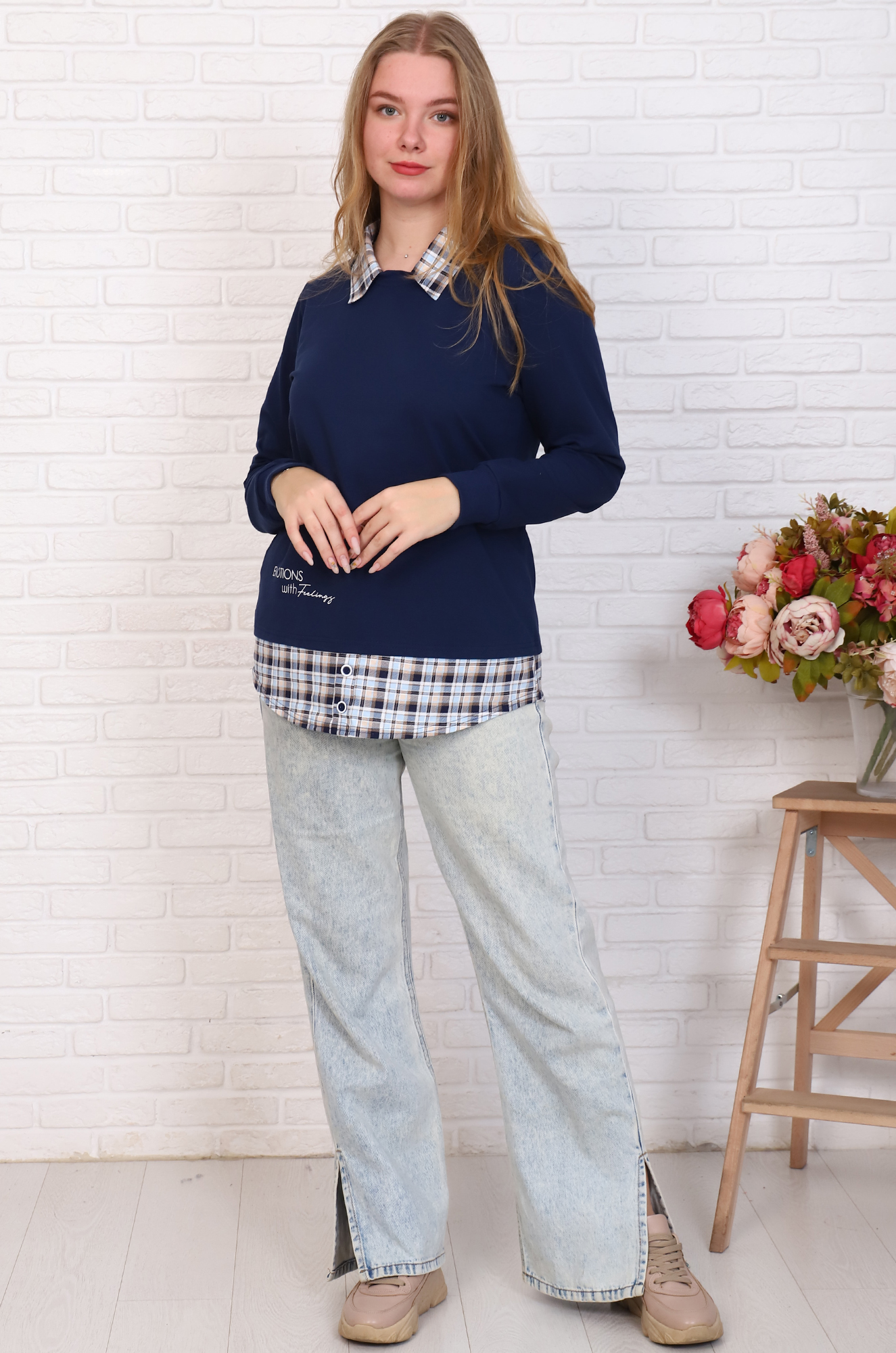 Стильная женская толстовка с имитацией рубашки. Отлично сочетается с джинсами и брюками. Комфортный и удобный вариант на каждый день.