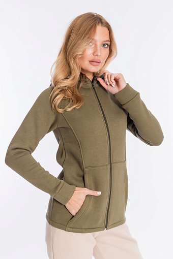 Женская толстовка, с центральной застёжкой на молнию, выполнена из полотна с начёсом. В модели предусмотрен капюшон. Длинные рукава покроя реглан на манжетах внизу, по бокам расположены карманы.