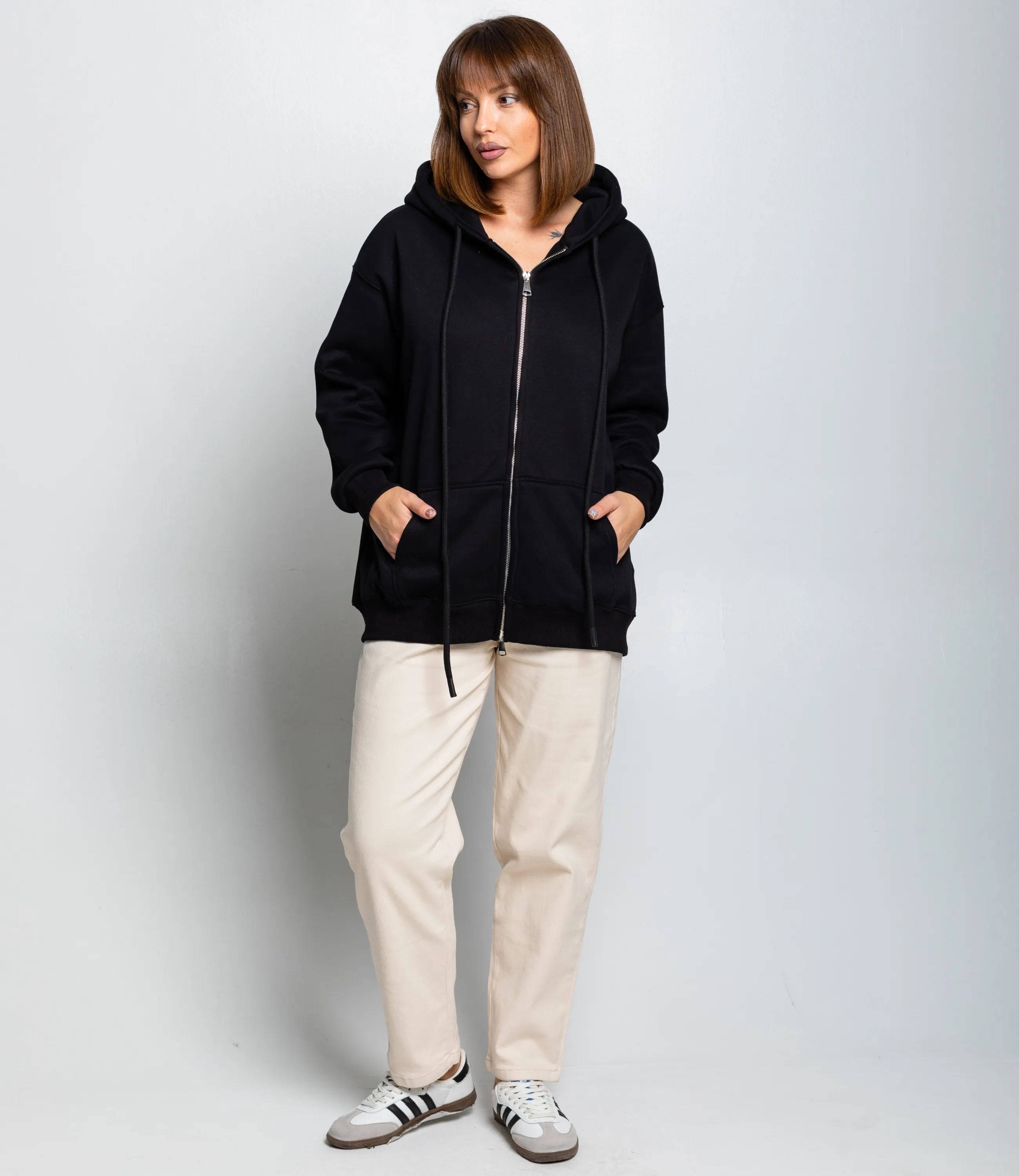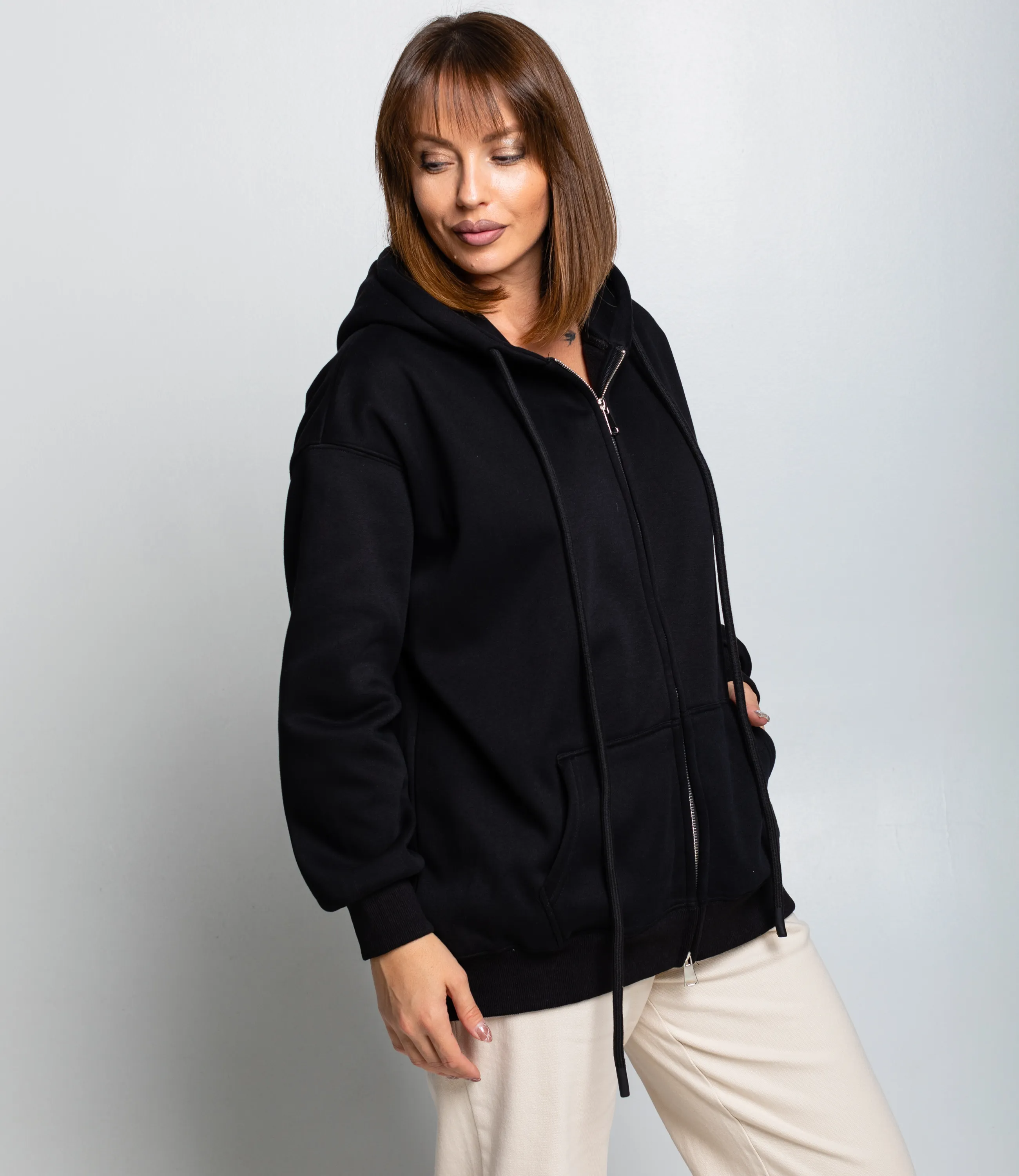 Толстовка – это идеальный элемент гардероба, который подчеркнёт комфорт каждой девушки. Худи выполнено свободного прямого кроя с опущенной линией плеч и длиной до уровня бёдер, с двухшовным капюшоном, оснащённым длинными плоскими шнурками; центральная металлическая двухходовая молния проходит по всей передней длине, сверху прикрытая стойкой капюшона, по низу и на манжетах — широкие трикотажные резинки для плотной посадки; на передней панели два накладных кармана‑кенгуру с боковыми входами, швы плоские и аккуратные, линия плеч сглажена для комфортной свободы движений, рукава слегка заужены к манжетам. Для пошива использована ткань с составом 85% хлопка и 15% дакрон, что обеспечивает отменное качество и долговечность. Даже после многократных стирок толстовка останется в отличном состоянии. Вы сможете носить её с большим удовольствием. Обратите внимание на представленный цвет – он глубокий и соответствует фотографии на сайте. Чтобы вы были уверены в размере, на странице доступна таблица с размерами. Воспользовавшись ею, вы сможете обмерить себя и убедиться в правильности выбора. Наша цена является доступной и адекватной. Не упустите возможность подарить себе комфорт и стиль! Вы можете заказать онлайн презентацию на интересующие Вас модели. Наши менеджеры свяжутся с Вами и проведут индивидуальную видеотрансляцию, помогут составить заказ и ответят на Ваши вопросы.