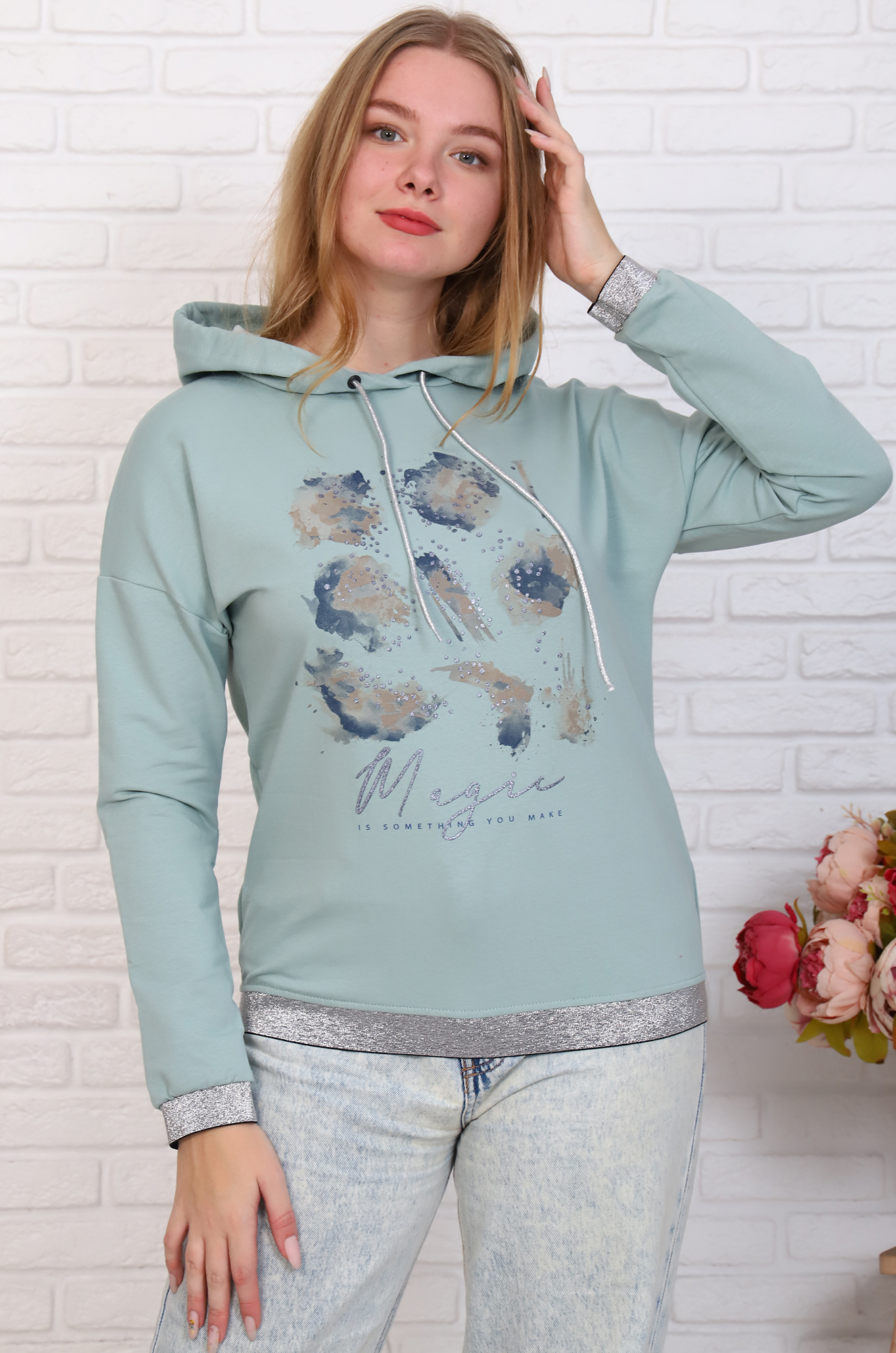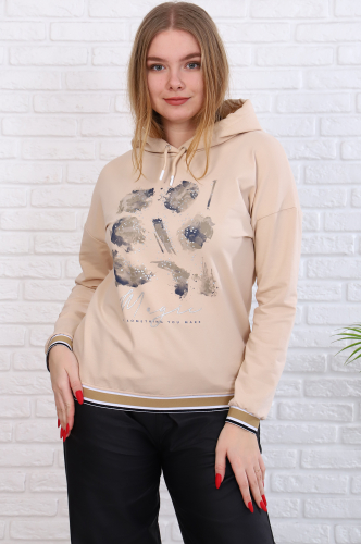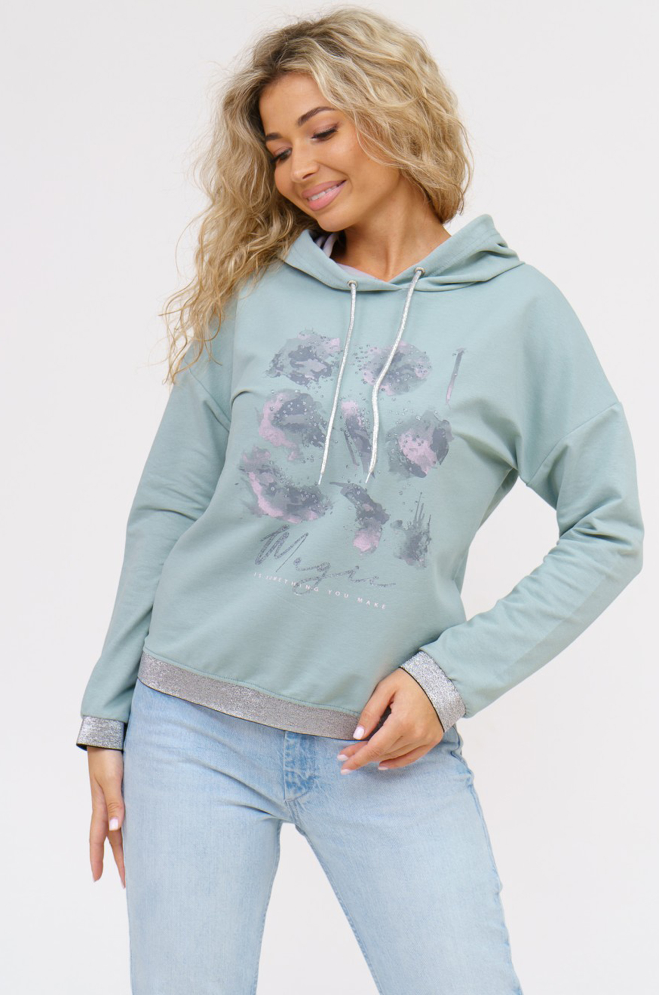 Стильная женская толстовка с капюшоном. Модель прямого кроя, на полочке печатный принт, низ изделия и рукава на эффектной широкой резинке с люрексом.