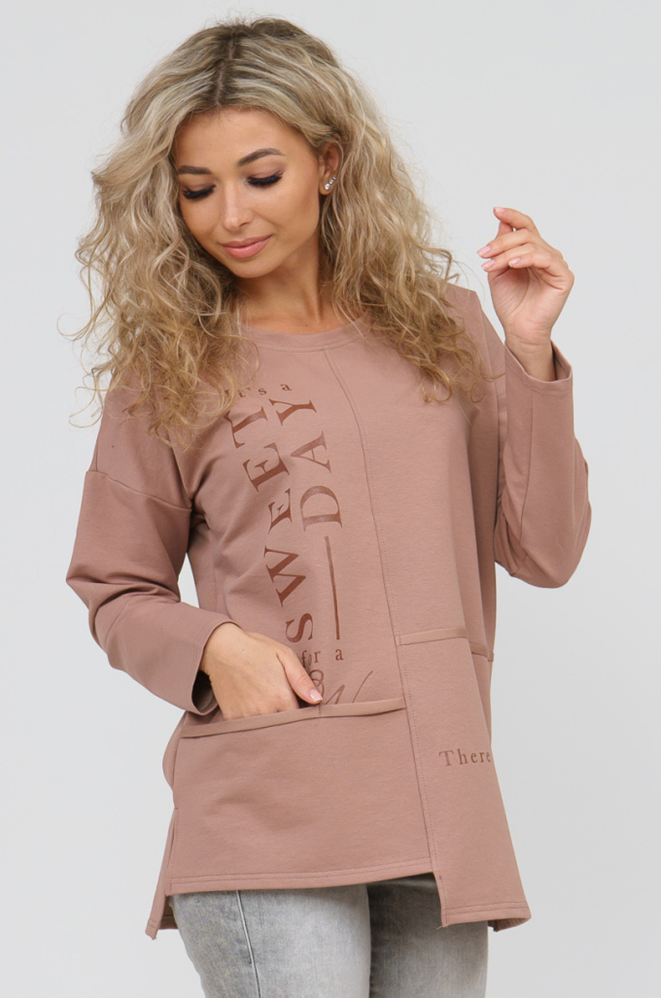 Удобная стильная женская толстовка-туника для тех, кто следит за модой и хочет быть в тренде! Модель свободного кроя в стиле "оверсайз", плечо спущенное. Низ изделия ассиметричный, по бокам разрезы. На полочке оригинальный принт и внутренний карман. Отличный вариант к джинсам, брюкам, шортам, леггинсам. Ткань - футер двухнитка с добавлением лайкры. Мягкая и шелковистая, приятная к телу, прекрасно сидит на фигуре и великолепно держит форму.