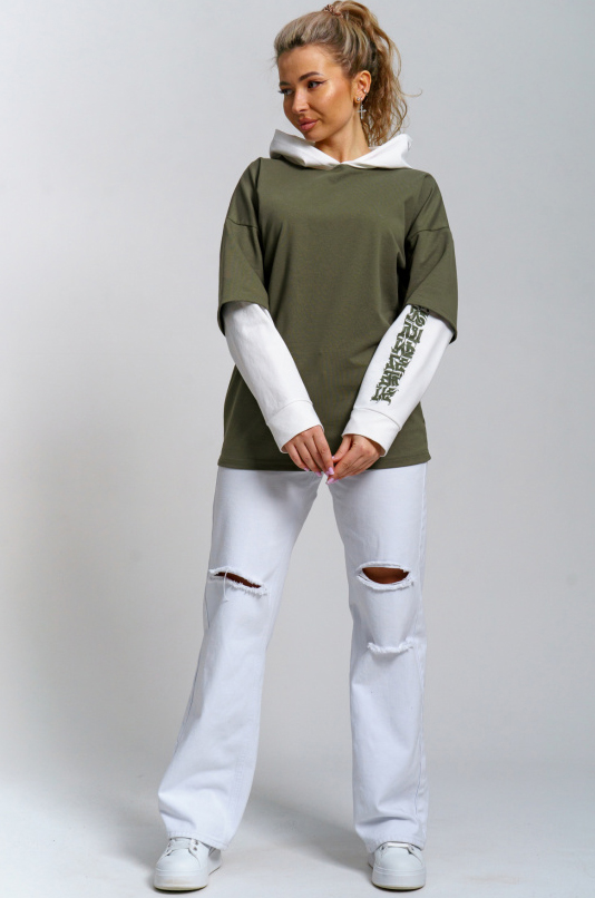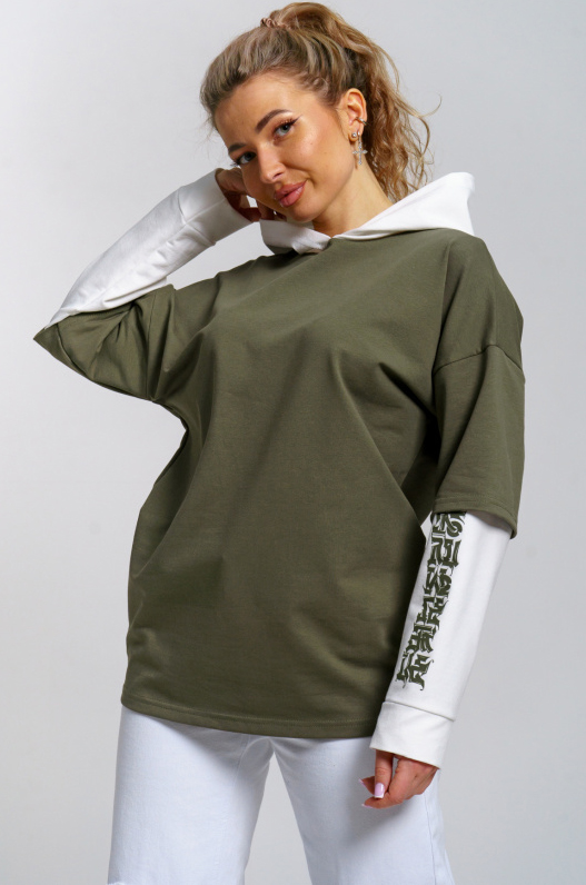 Стильная женская толстовка с капюшоном - имитация "двойки". Модель свободного кроя, на рукаве эффектный печатный принт..