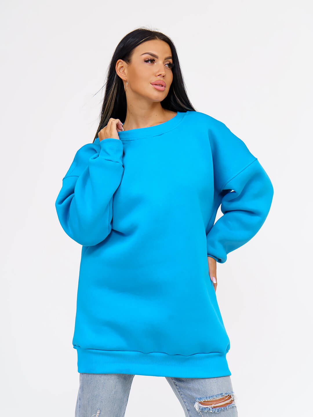 Толстовка женская оверсайз выполнена из качественного хлопкового трикотажа с начесом (футер 3-х нитка с начесом). который не деформируется при стирке и во время носки, благодаря этому материалу однотонный свиншот утепленный будет радовать вас своим видом и дарить приятные тактильные ощущения не один сезон. Стильная базовая толстовка подчеркнет достоинства фигуры. Теплая и уютная вещь в спортивном стиле заменит вам худи с начесом из флиса и школьную кофту, пуловер и толстовку с капюшоном, свитер и джемпер. Удлиненная толстовка свободного кроя деликатно скроет несовершенства полной фигуры. Объемная модель с длинным рукавом на манжете и округлым вырезом горловины удобна в повседневной носке: она не сковывает телодвижения, отлично комбинируется с одеждой разных стилей и фасонов, цветов и фактур.