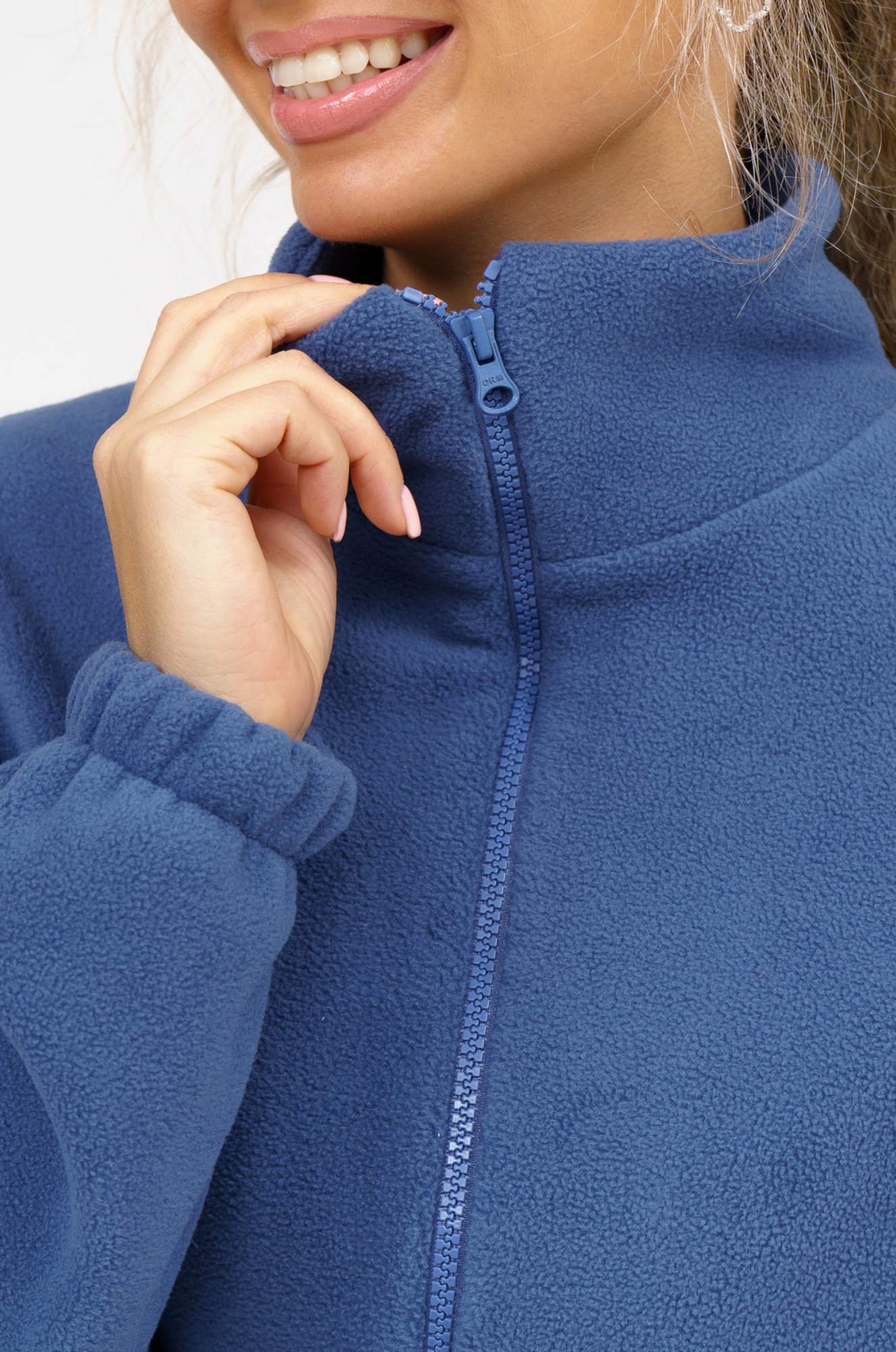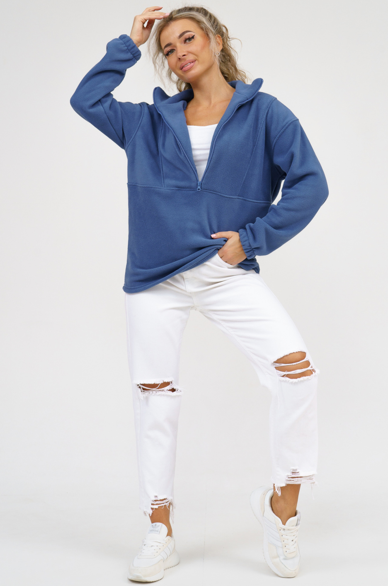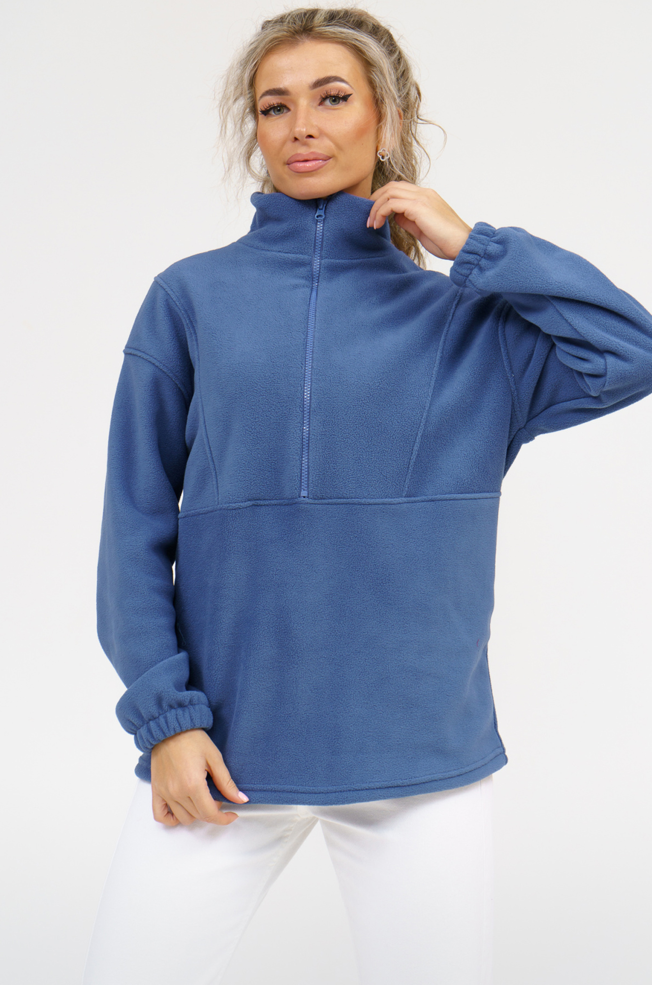 Стильная женская флисовая толстовка в сопортивном стиле. Отрезная кокетка на молнии, воротник-стойка. Модель без карманов.