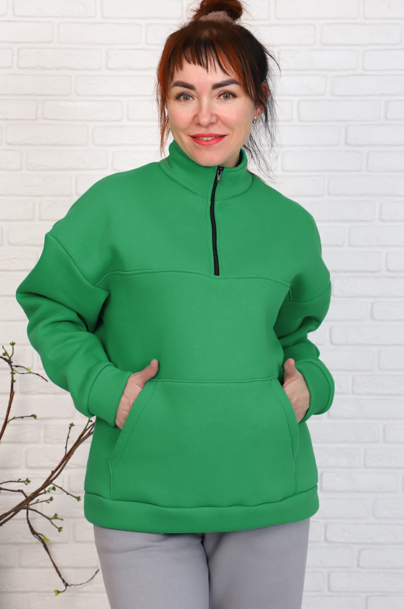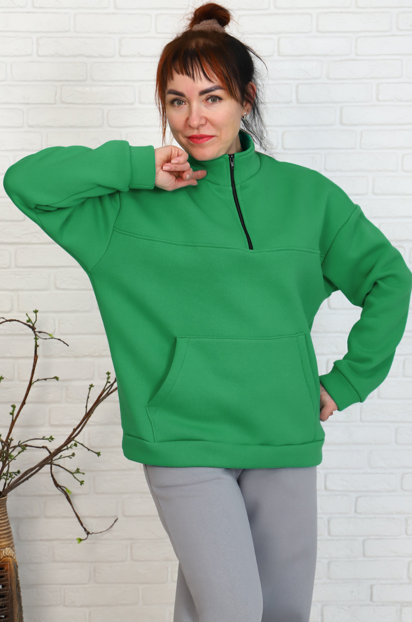 Тёплая, уютная и модная женская толстовка в спортивном стиле. Модель прямого свободного кроя, в размере оверсайз. Воротник-стойка на короткой молнии, низ тостовки и рукав на манжете из основной ткани, плечевой шов спущенный, удобный карман-кенгуру. Можно сочетать и с джинсами, и со спортивными брюками.