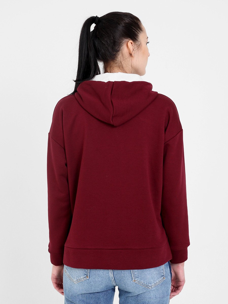 Женская толстовка в спортивном стиле Comfort fit (свободного покроя). Выполнена из комфортного трикотажного полотна футера. Длинные рукава с манжетами, удобный капюшон на подкладке цвета экрю с хлопковым белым плоским шнуром. В боковых швах разрезы.