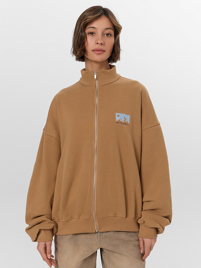 Бежевая женская толстовка на молнии с надписью «Момент» — идеальный спутник для ваших самых ярких дней. Свободный оверсайз крой и воротник-стойка, облегающий шею, надежно защищает от ветра и прохлады, даря ощущение комфорта. Длинные рукава с эластичными манжетами и поясом из рибаны мягко облегают фигуру, подчеркивая стильный силуэт.