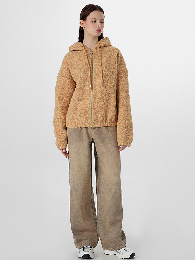 Бежевая женская толстовка на молнии с капюшоном создана для повседневного комфорта. Модель свободного кроя со спущенной линией плеча обеспечивает свободу движений. Удобная металлическая молния и регулируемый капюшон на шнурке делают толстовку практичной в прохладное время года.
