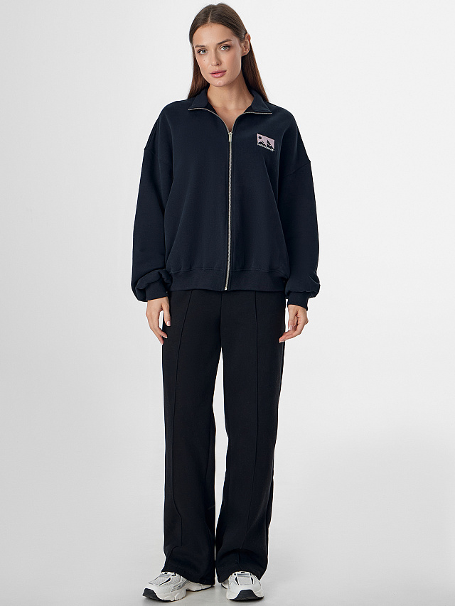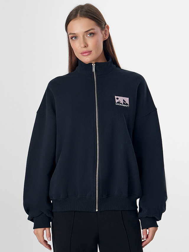 Черная женская толстовка на молнии с надписью «Момент» — идеальный спутник для ваших самых активных дней. Свободный оверсайз крой и воротник-стойка, облегающий шею, надежно защищает от ветра и прохлады, даря ощущение комфорта. Длинные рукава с эластичными манжетами и поясом из рибаны мягко облегают фигуру, подчеркивая стильный силуэт.