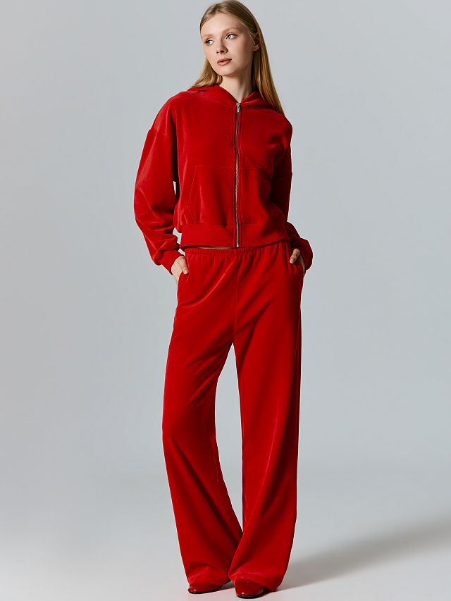 Красная толстовка на молнии с надписью «Сердцеедка» или «Разбивательница сердец». Надпись добавляет образу дерзости и игривости, но при этом сама толстовка остаётся удобной и практичной вещью на каждый день.