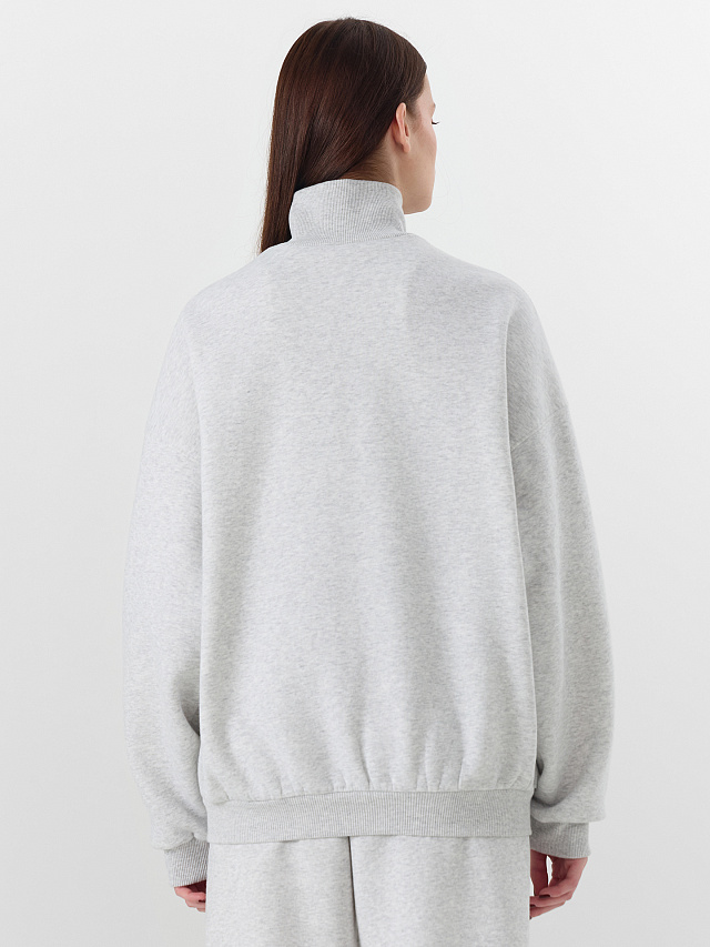 Толстовка имеет силуэт оверсайз со спущенным плечом и длинными рукавами. Воротник-стойка из эластичной рибаны и округлая горловина обеспечивают комфорт и защищают от ветра. Боковые швы смещены вперед — в них расположены удобные карманы с мягкой подкладкой. Манжеты на рукавах и пояс из рибаны мягко фиксируют изделие, сохраняя тепло.