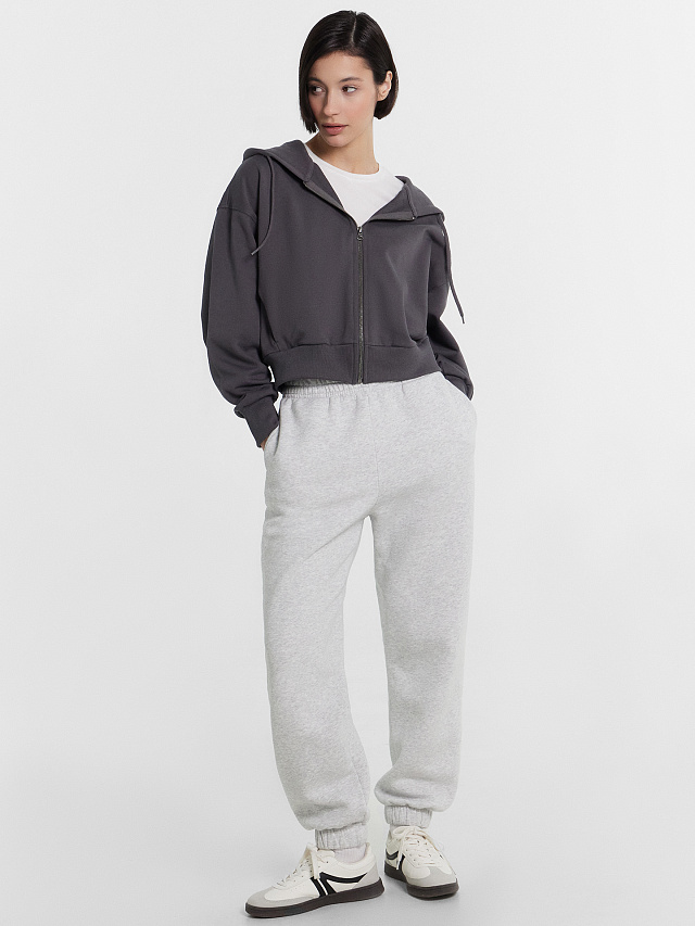 Укороченная женская толстовка – стильный и удобный выбор для вашего гардероба. Капюшон на кулиске обеспечивает защиту от ветра, а центральная застежка на молнию позволяет легко надевать и снимать изделие. Длинные рукава с эластичными манжетами из рибаны удерживают тепло и обеспечивают комфорт, в то время как спущенная линия плеча придает стильный и расслабленный вид. Боковые карманы добавляют функциональности, позволяя хранить мелкие вещи. Выполненная из футера без подчеса, толстовка отличается мягкостью и долговечностью, обеспечивая комфорт при носке. Она идеально подойдет для создания повседневных и спортивных образов, легко сочетаясь с различными элементами гардероба.