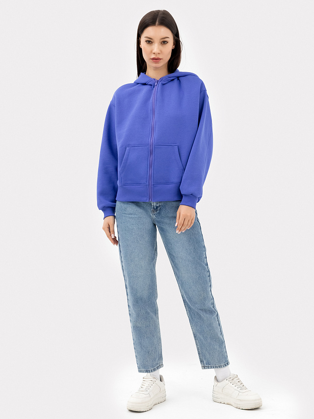 Комфортная и уютная женская толстовка в спортивном стиле. Выполнена из футера с теплым и нежным подчесом. Силуэт свободный – оверсайз, длина до середины бедер. Спущенная линия плеча и углубленная пройма дарит свободу движений. Рукава длинные и свободные, с манжетами. Капюшон просторный, есть удобный карман-кенгуру. Спереди толстовка застегивается на молнию. Рекомендуем!
