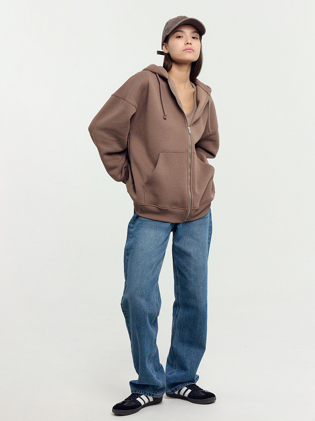 Стильная толстовка женская свободного силуэта (оверсайз) из футера с подчесом. В составе изделия высококачественный хлопок. Горловина круглой формы. Капюшон с подкладкой. Рукава длинные, плечо спущено. По низу рукава отрезная манжета из рибаны. Центральная застежка на молнию. Спереди есть накладной карман-кенгуру. Пояс из рибаны. Комфортная и трендовая модель для создания лаконичных образов на каждый день. Дополнить такую толстовку можно низом на свой вкус из базовой коллекции для женщин. Широкий размерный ряд. Модель представлена в нескольких цветах.
