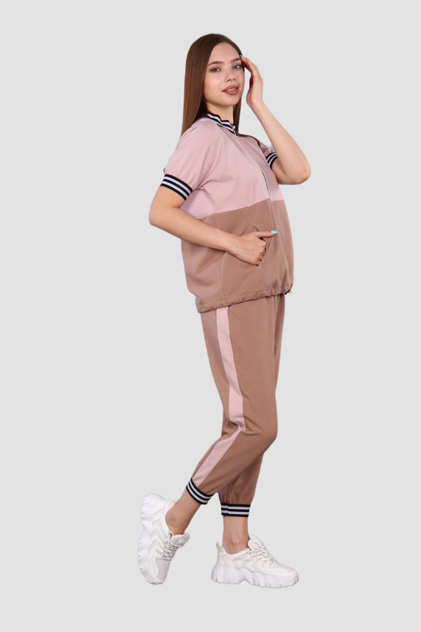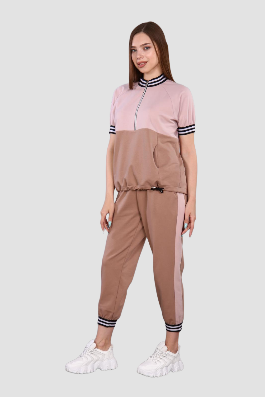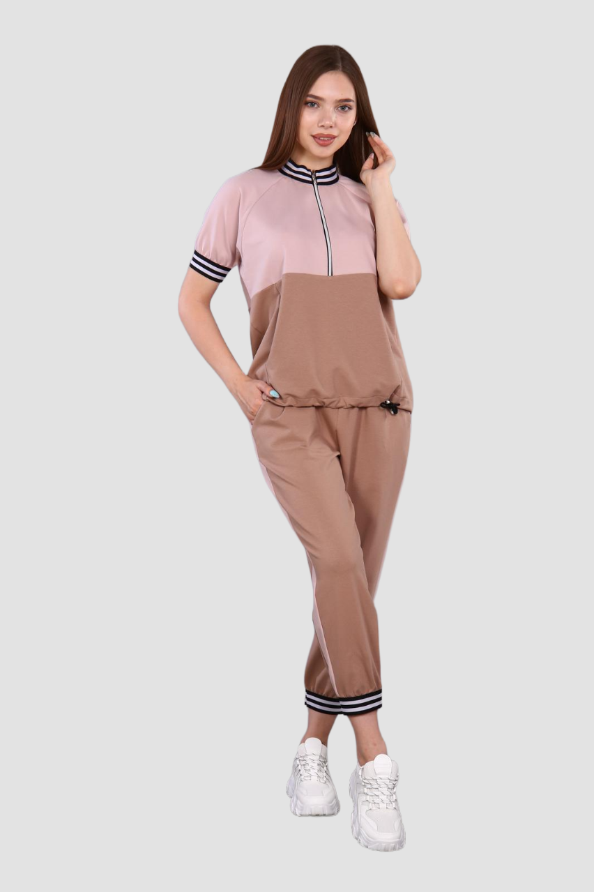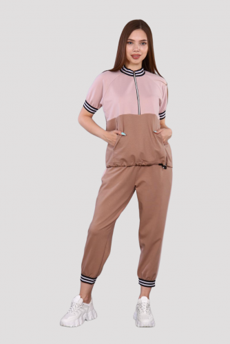 Женский костюм выполнен из трикотажного полотна "футер двунитка" двух контрастных расцветок. Свободные брюки, длиной 7/8 из более темного полотна с лампасом из отделки, карманами в боковых швах и поясом на эластичной тесьме. Футболка свободного прямого покроя, рукав "реглан", верхняя часть футболки из отделочного полотна, нижняя из полотна тёмного цвета. Горловина футболки на молнии, на нижней части переда расположены карманы, низ футболки на кулиске. Горловина, манжеты рукавов и манжеты брюк выполнены из декоративной эластичной тесьмы. Костюм обращает на себя внимание сочетанием цветов и деталями отделки и прекрасно впишется в ваш гардероб.