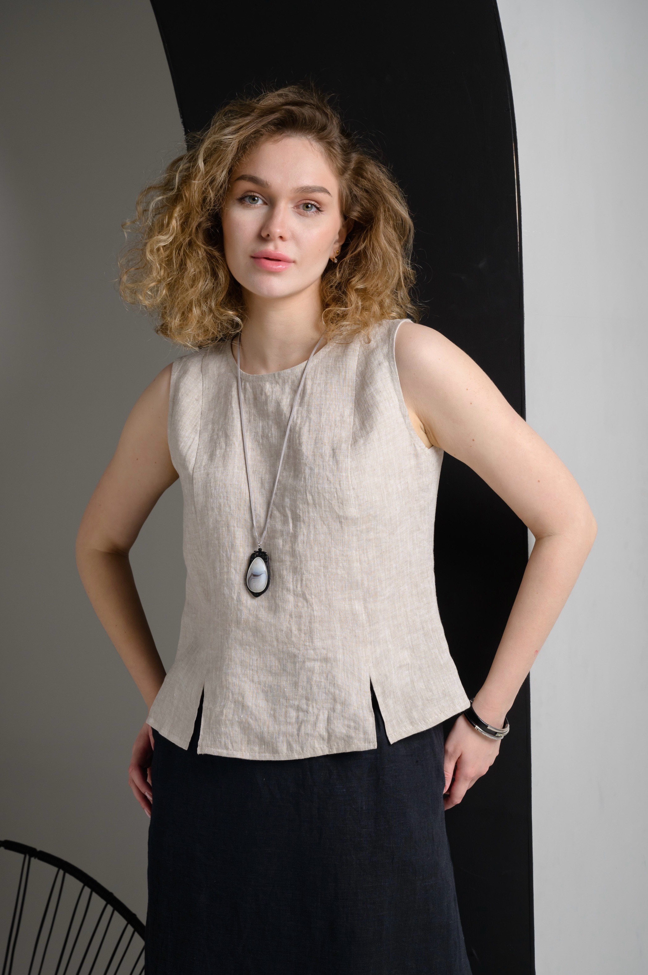 Льняной топ ̶̶– базовая универсальная вещь, позволяющая создавать максимальное количество сочетаний (луков). Он не выходит из моды, его можно носить и на пляже и в городе. Такой топ будет универсальным элементом любых сложных образов, отлично сочетается с дорогой бижутерией и интересной обувью. Перед с рельефами, что в отличие от выточек подходит на любой рост. Топ можно носить как навыпуск, так и заправленным за счет небольших разрезов спереди.