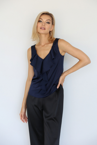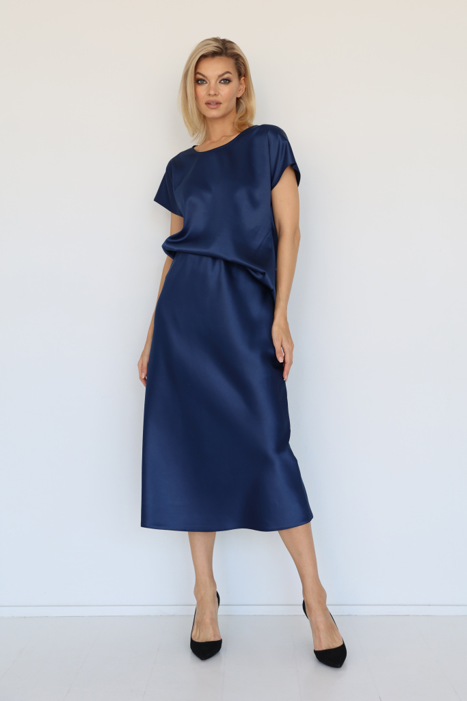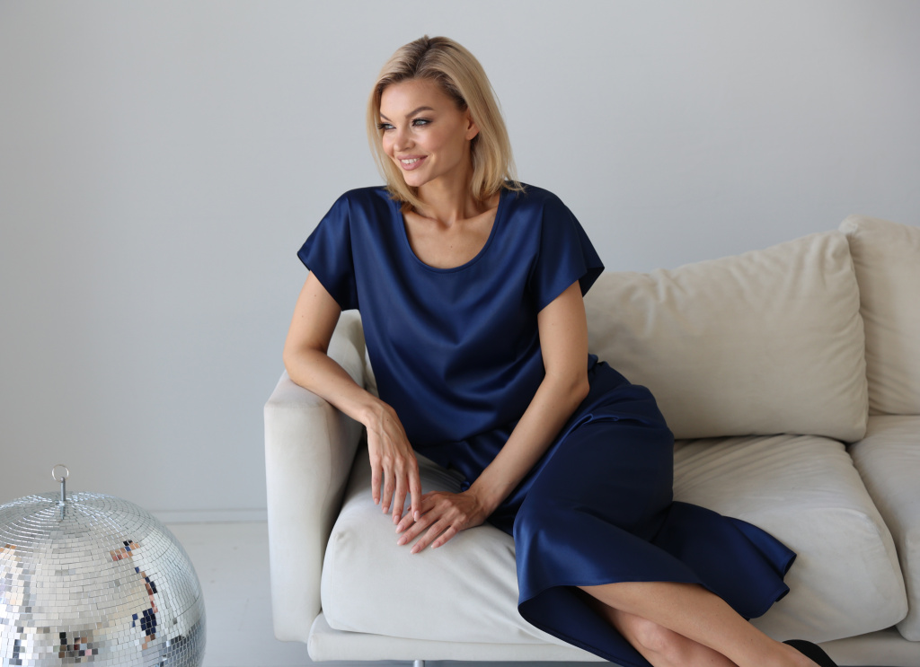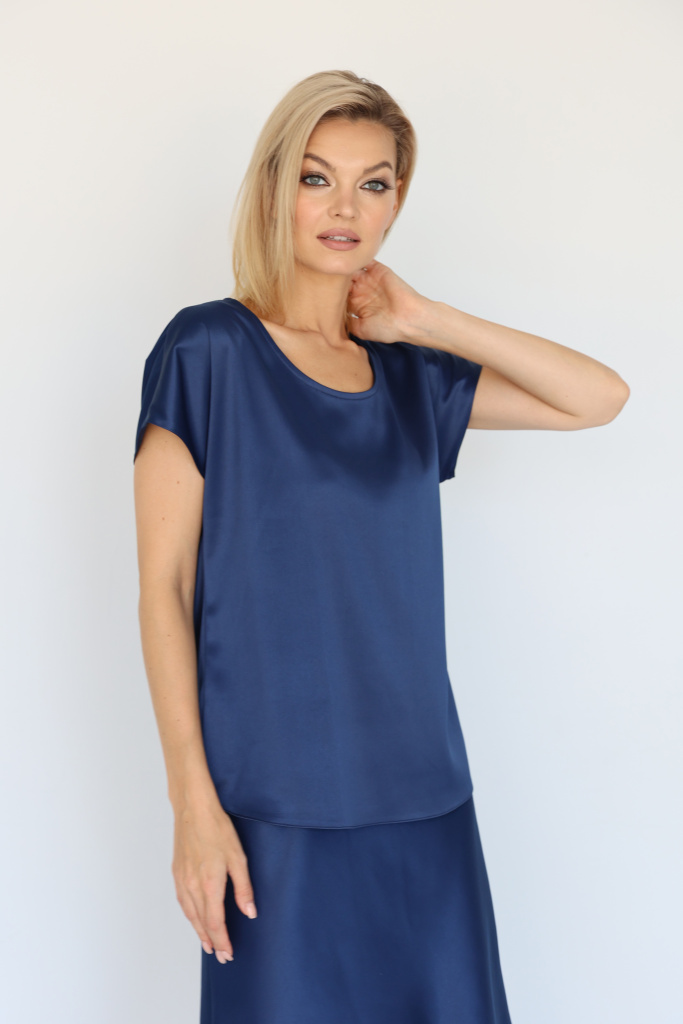 Топ свободного кроя с короткими  цельнокроенными рукавами и круглым вырезом горловины. Плотная ткань с мягким атласным блеском