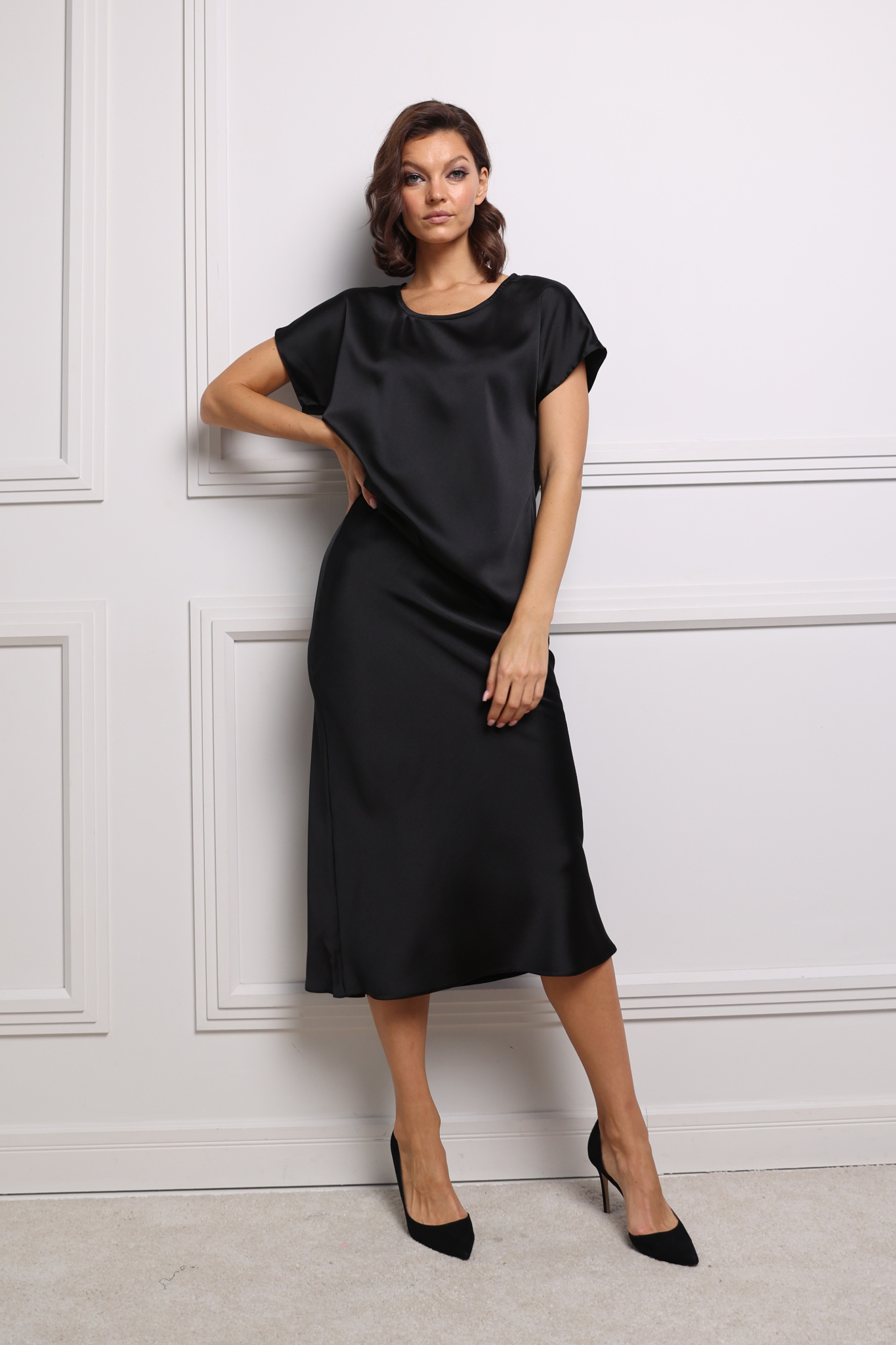Топ свободного кроя с короткими  цельнокроенными рукавами и круглым вырезом горловины. Плотная ткань с мягким атласным блеском