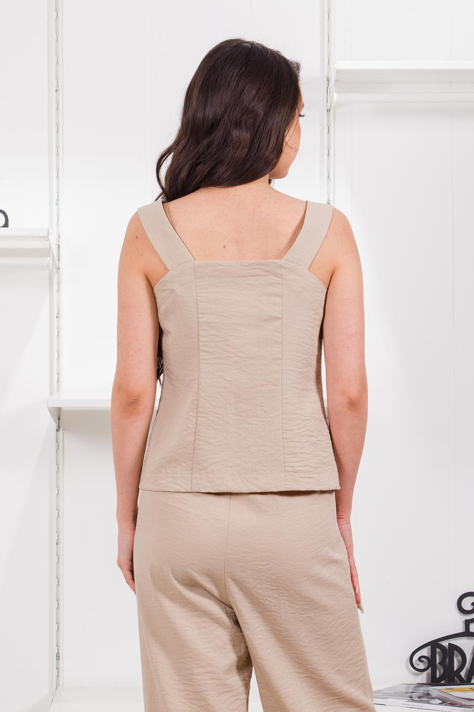 Описание: Топ на пуговицах и широких бретелях выполнен в корсетном стиле, но при этом достаточно свободный и комфортный. Линии рельефов рисуют силуэт, а длина до бёдер позволит носить его и как топ, и как жилет.
