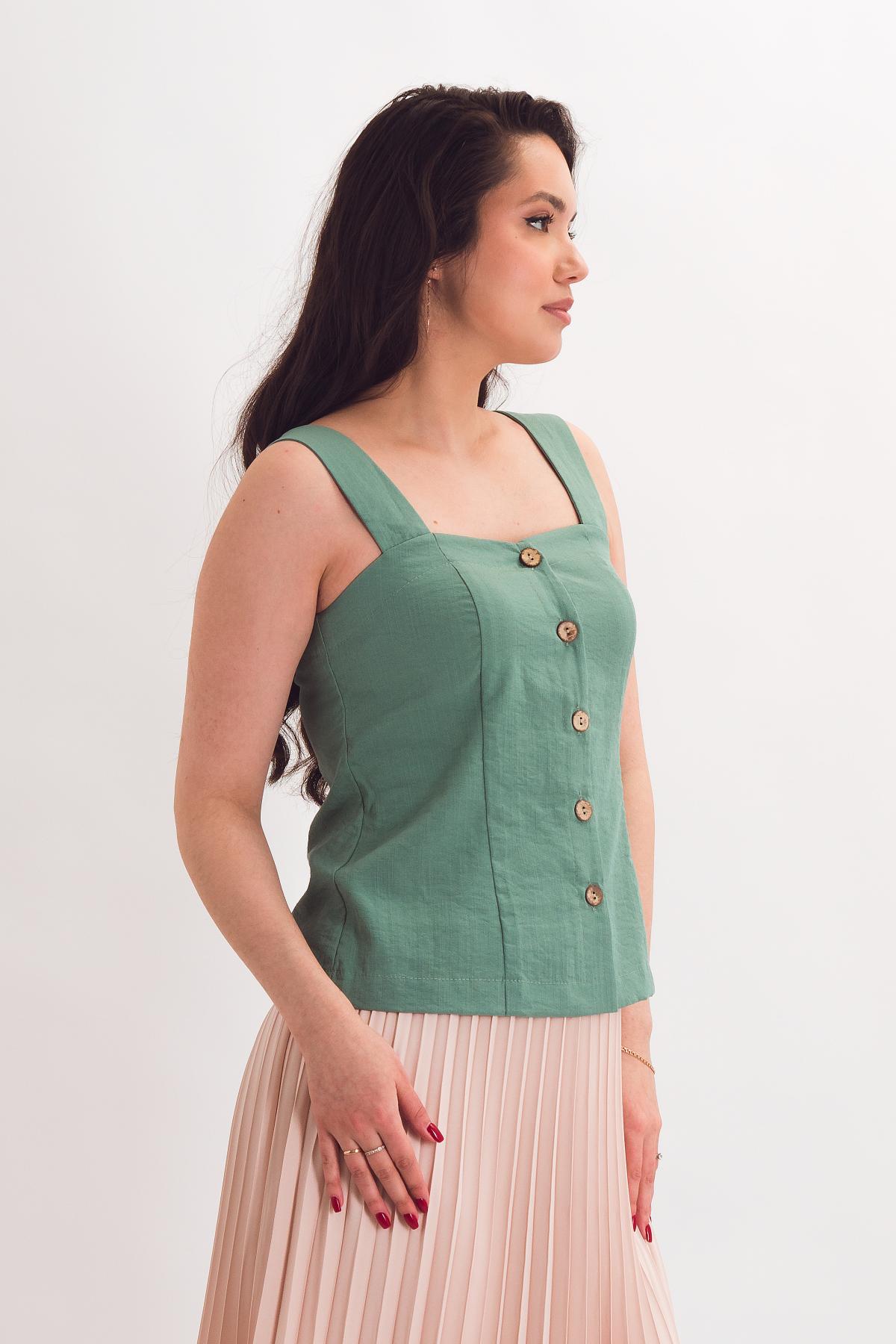 Описание: Топ на пуговицах и широких бретелях выполнен в корсетном стиле, но при этом достаточно свободный и комфортный. Линии рельефов рисуют силуэт, а длина до бёдер позволит носить его и как топ, и как жилет.