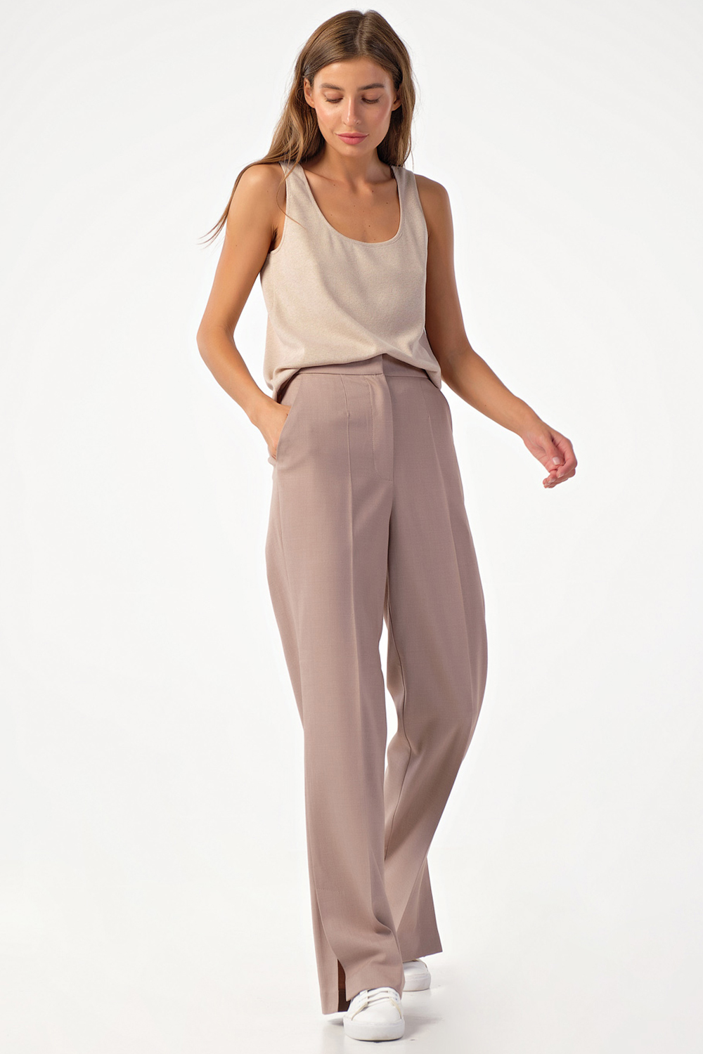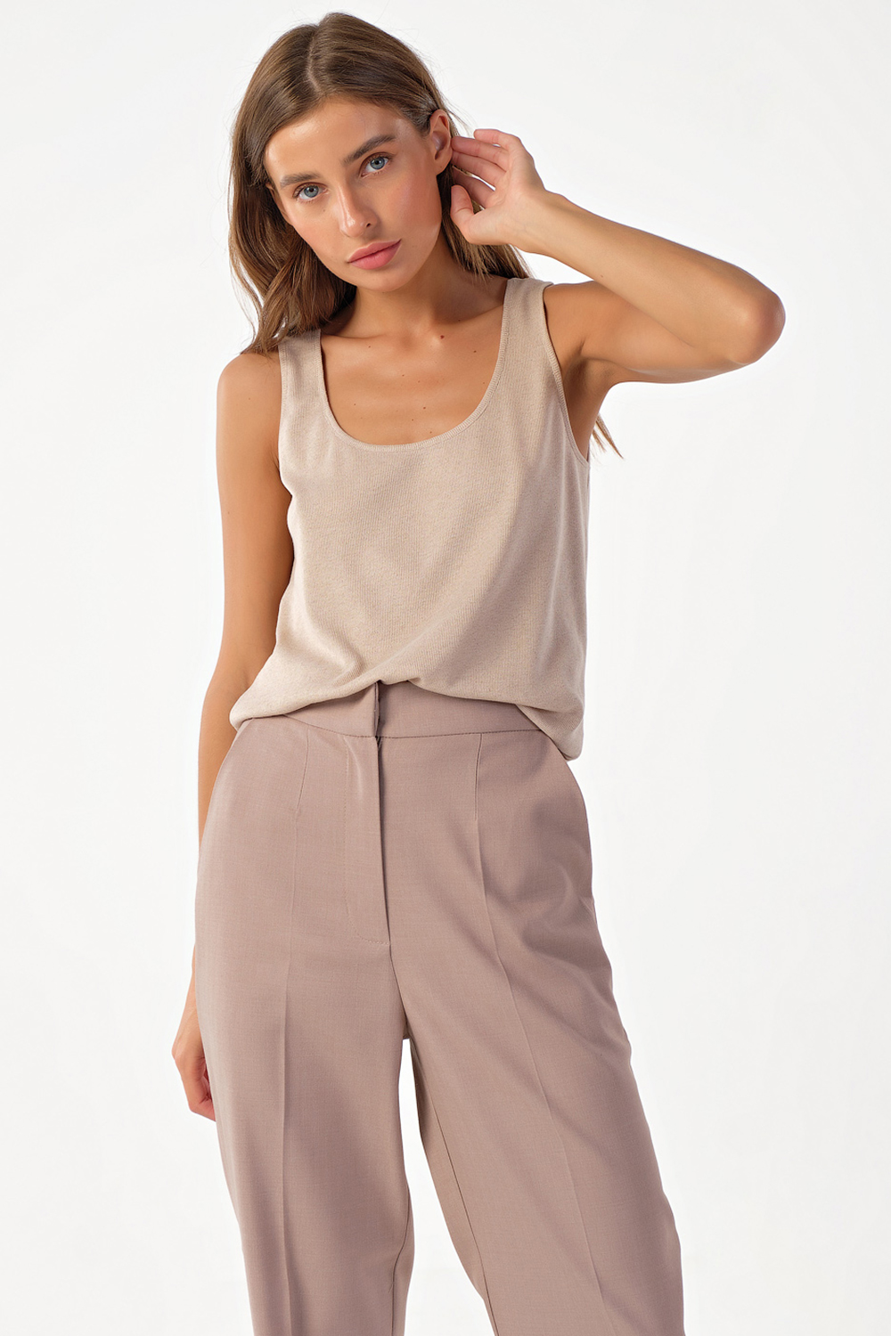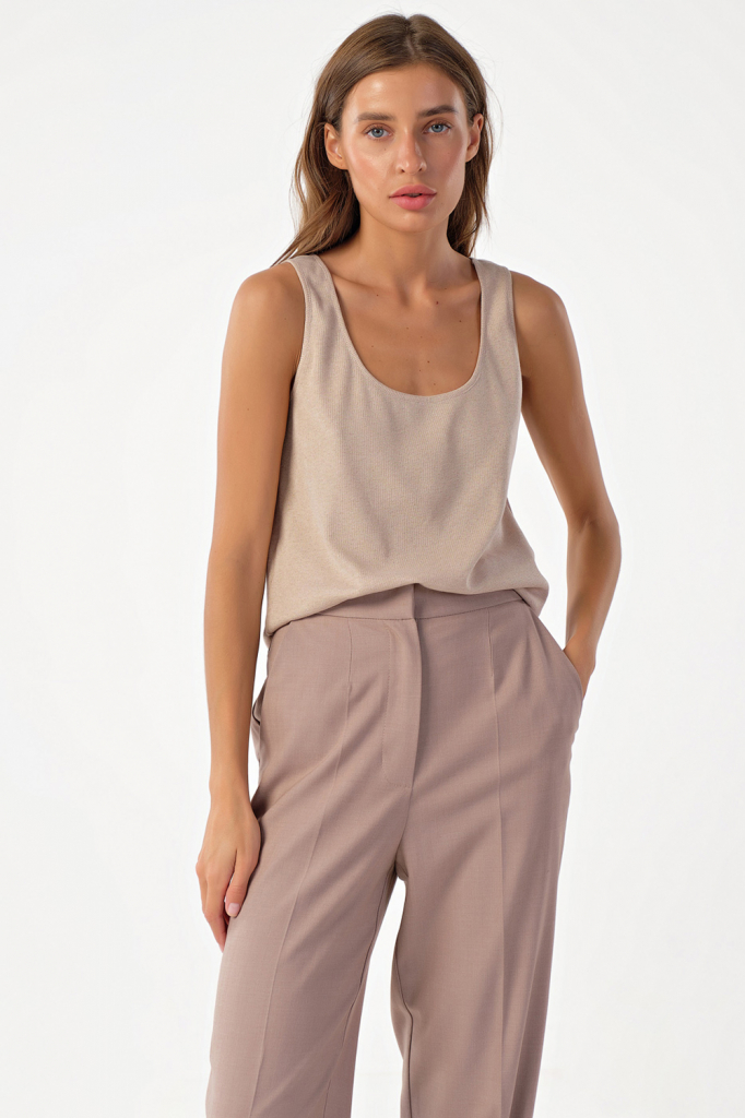 • Особенности: Топ-майка прямого силуэта из трикотажа в рубчик. Детали: глубокий вырез и проймы окантованы.