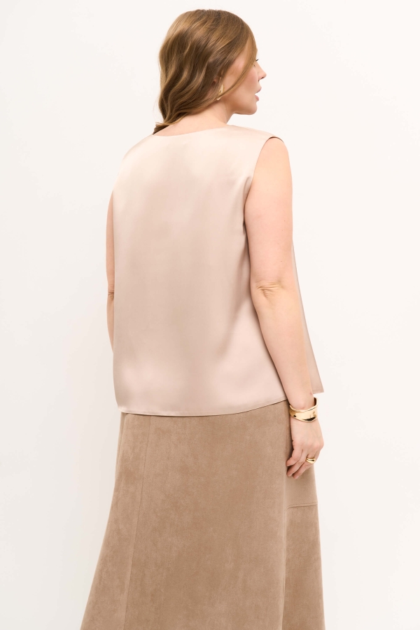 Топ из атласа высокого качества. Модель легкого А-силуэта. Низ ровный. V-образный вырез по переду.