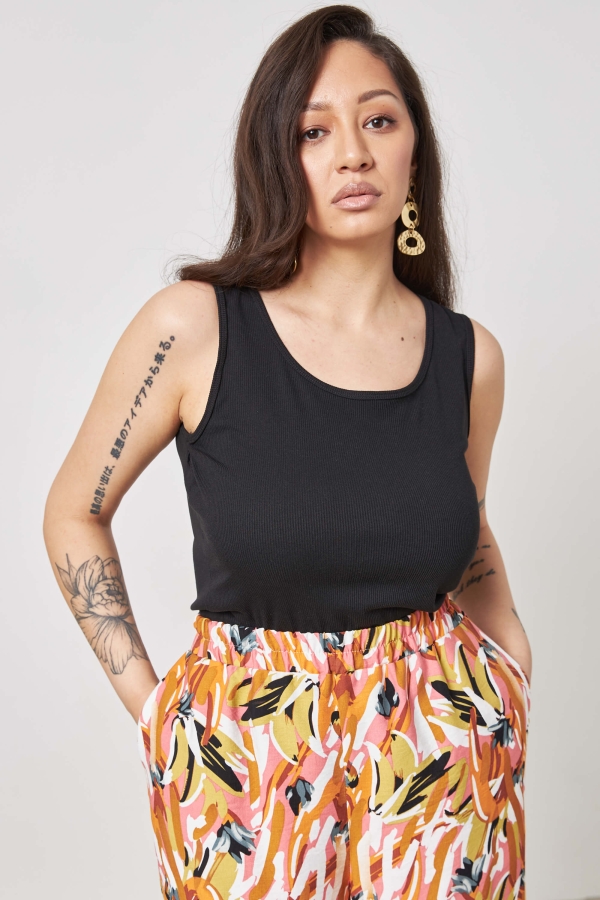 Майка прилегающего силуэта с круглой горловиной и цельнокроеными бретелями.
