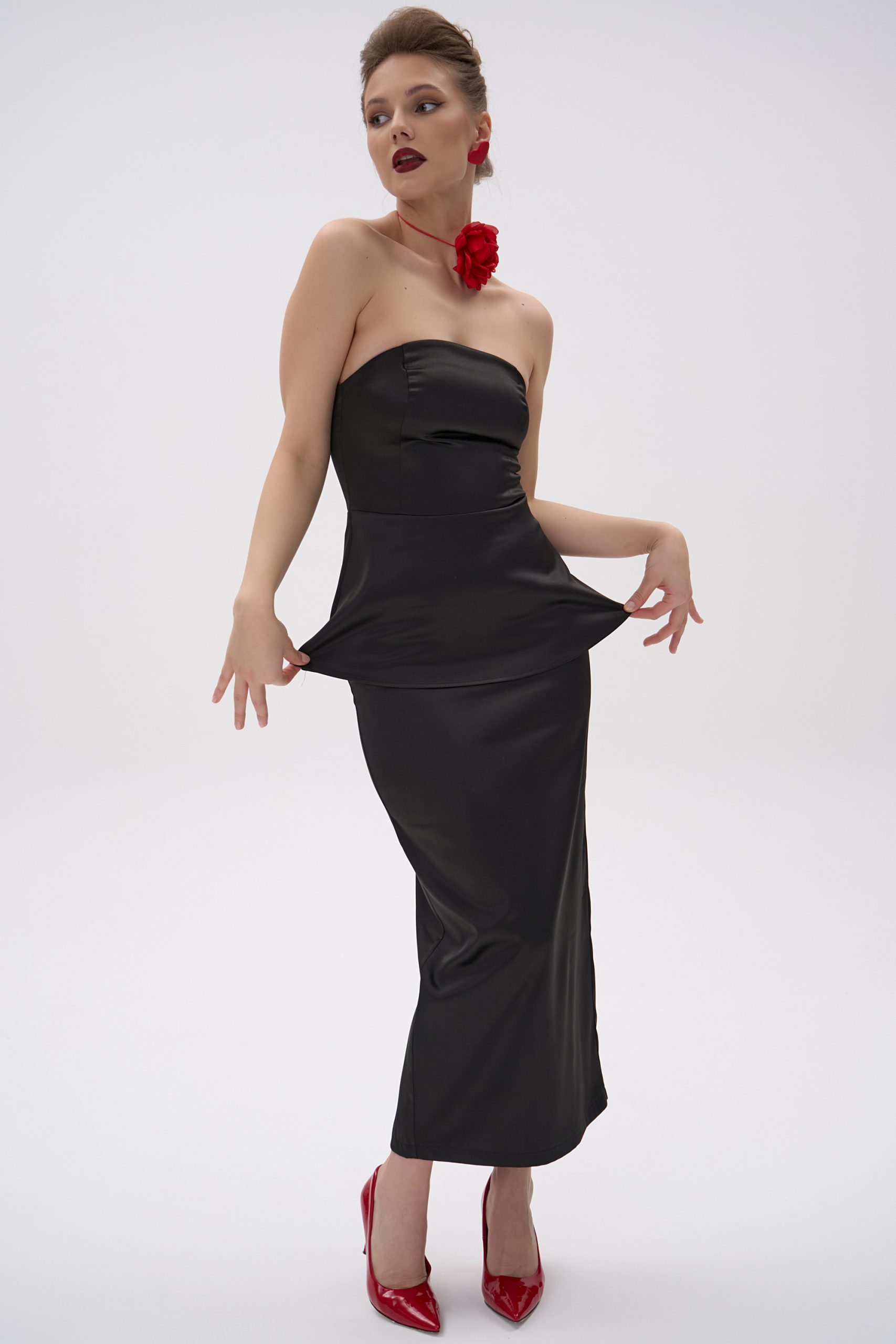 Костюм состоит из структурированного топа без бретелей и юбки миди прямого силуэта.
