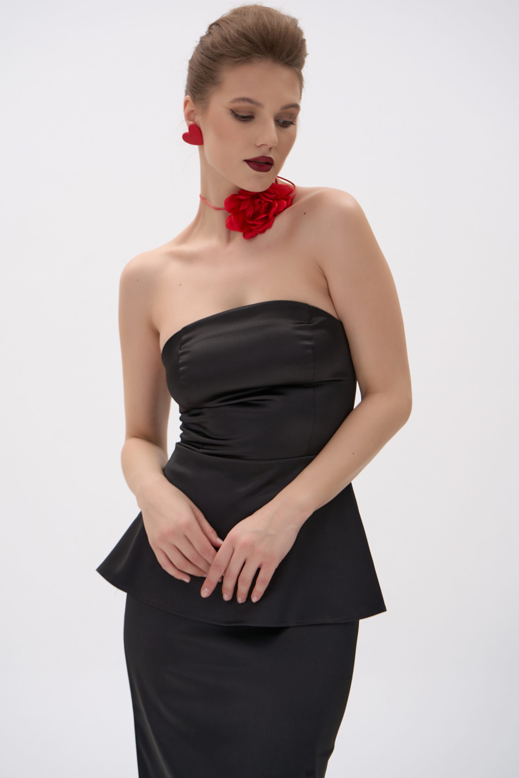Прямой верхний срез красиво подчёркивает линию плеч, ключицы и шею.