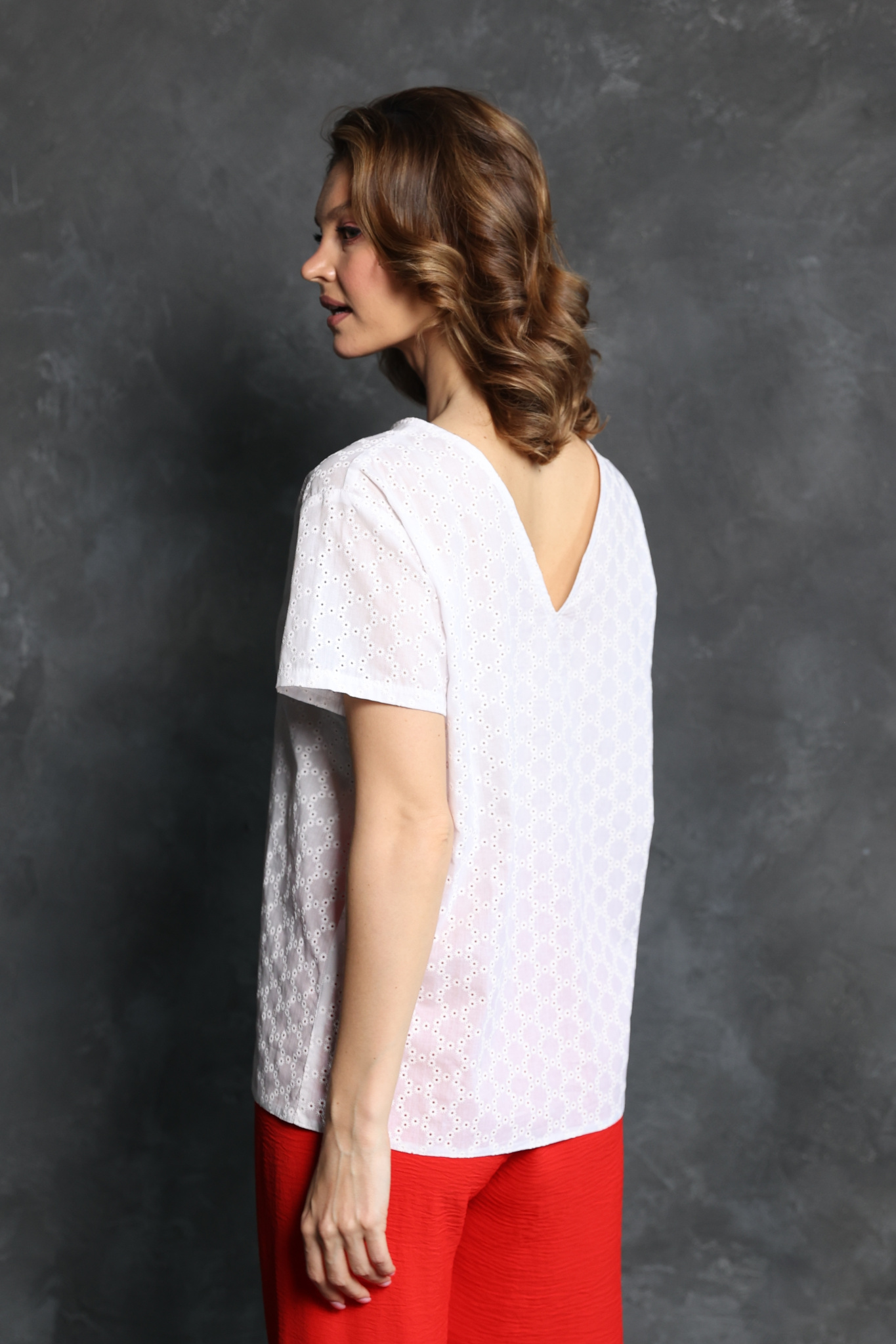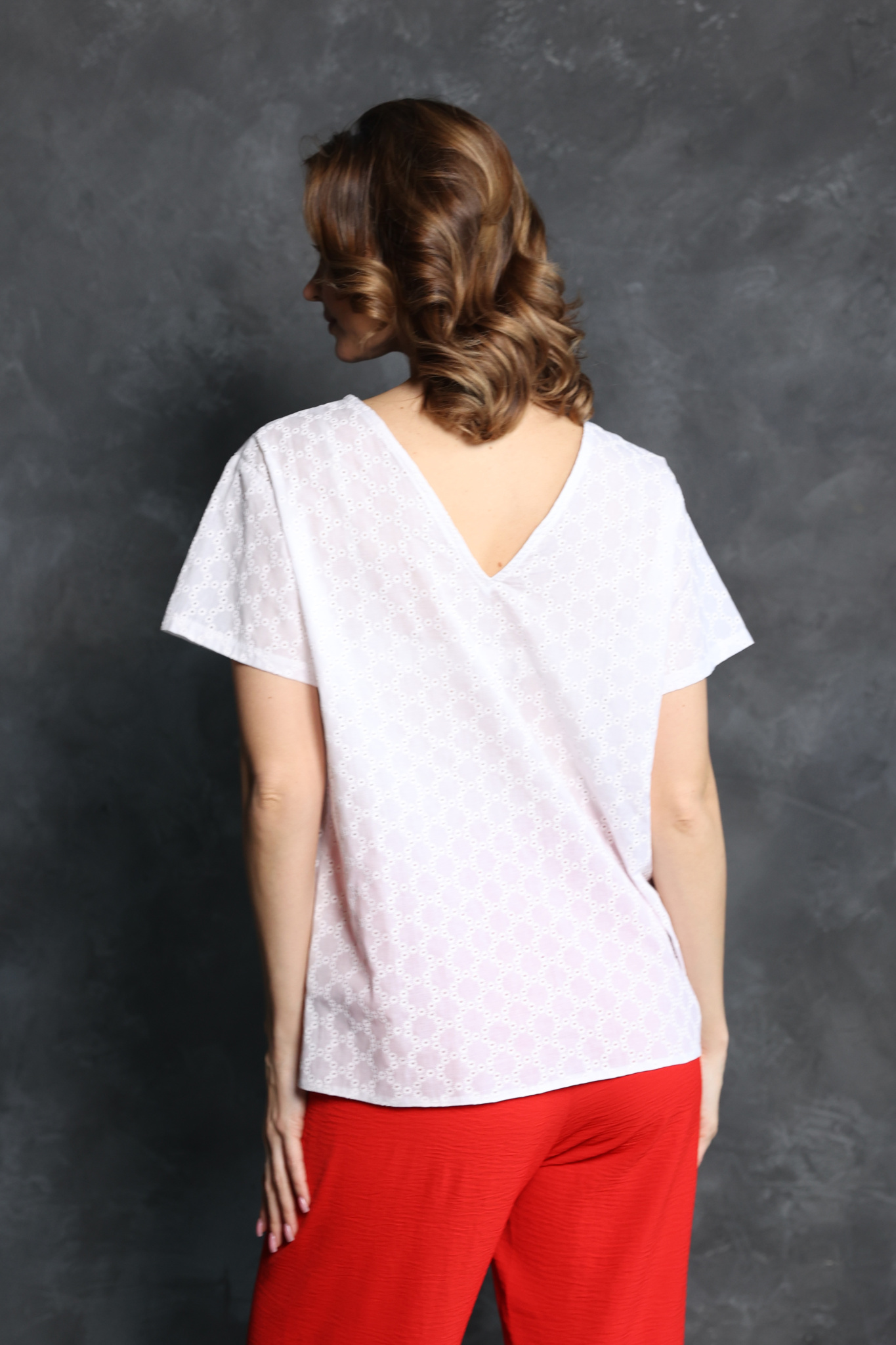 Топ свободного кроя с короткими рукавами. Носите V-вырезом спереди или сзади.