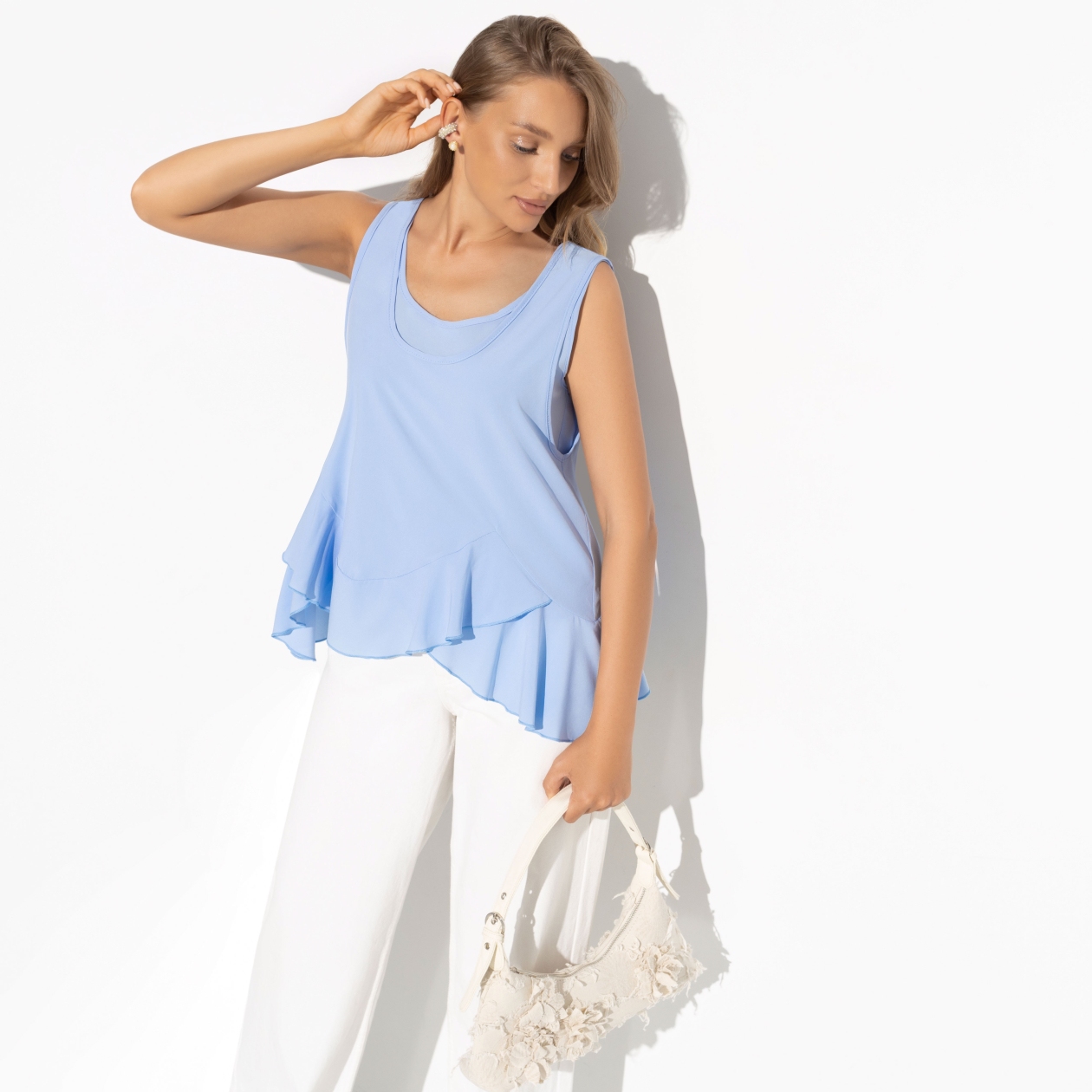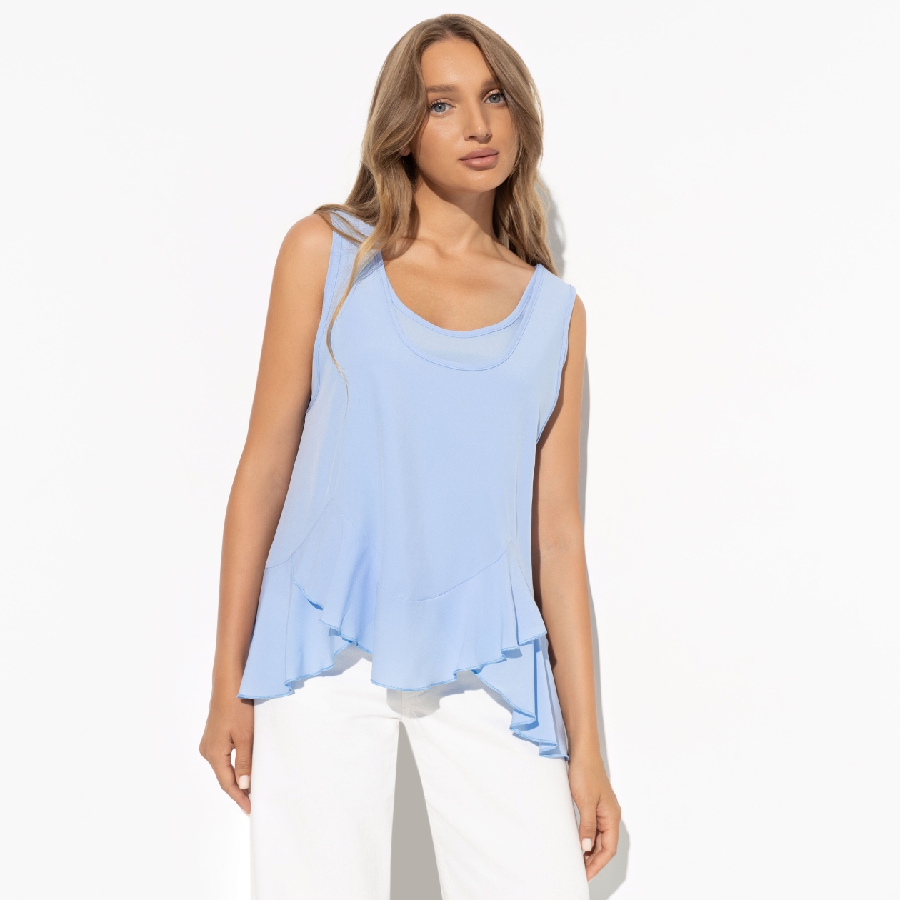 В списке обязательных дел значится поход в цветочный магазин за букетом для себя. Этим делом нельзя пренебрегать. Переносить тоже нельзя. Выбирайте топ в голубом цвете, он как нельзя лучше подходит для свидания с собой. Топ без рукавов с круглым вырезом. Линия выреза имитирует два слоя изделия. Оформлен рюшами.