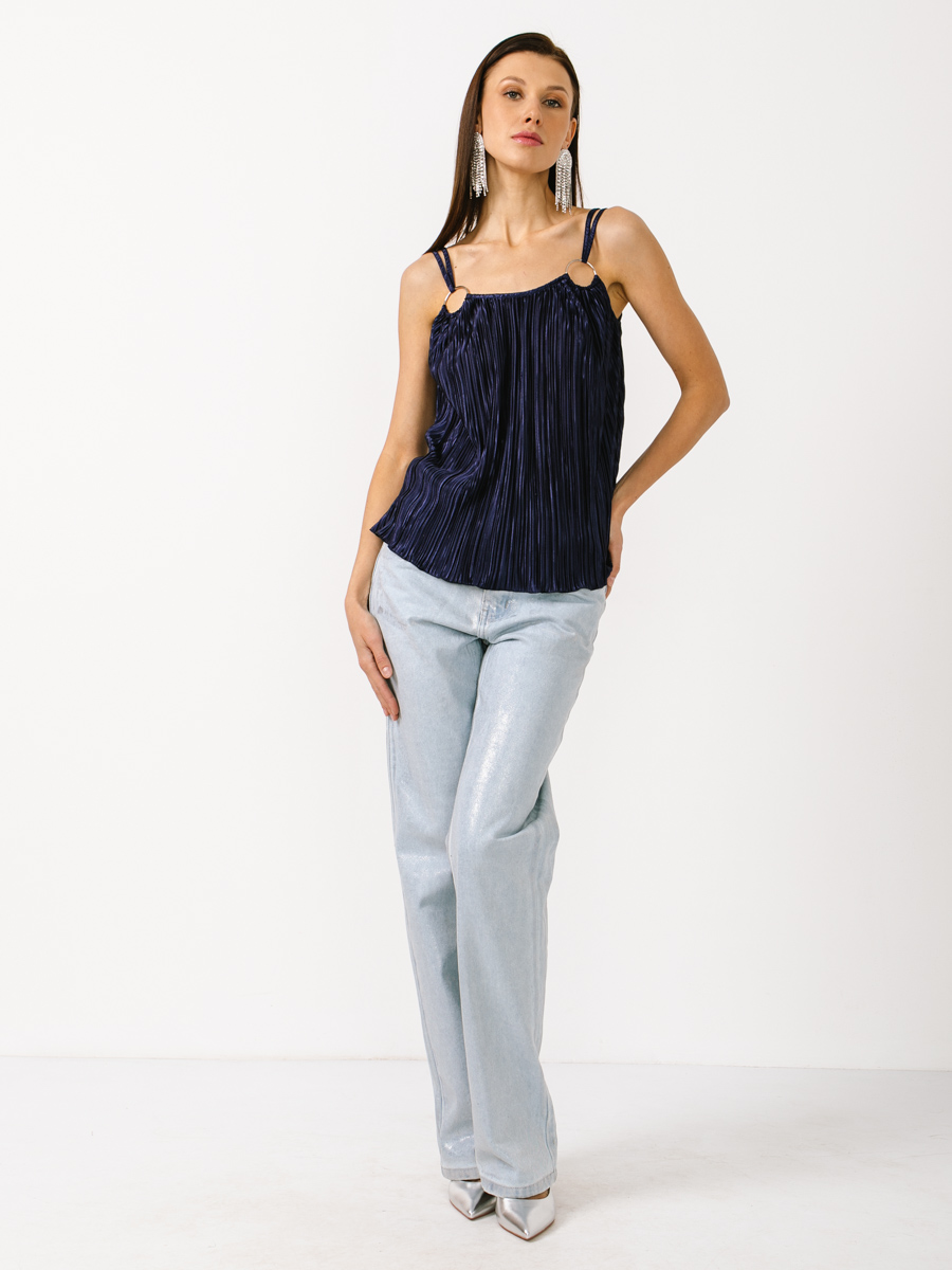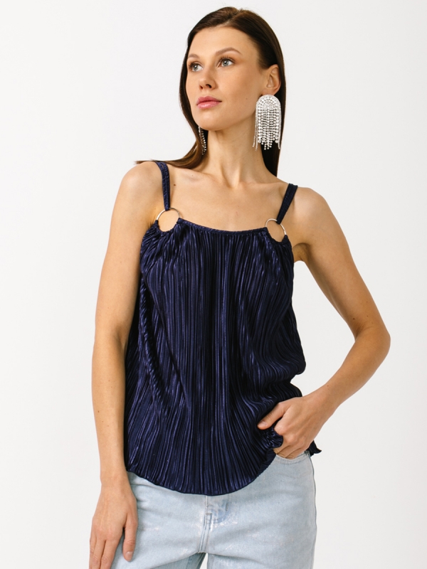 Топ на брителях с кольцами из атласной ткани-плиссе. На моделе топ 42 размера. Рост модели 173 см. Машинная деликатная стирка. Отжимать только вручную. Сушить строго в вертикальном положении.