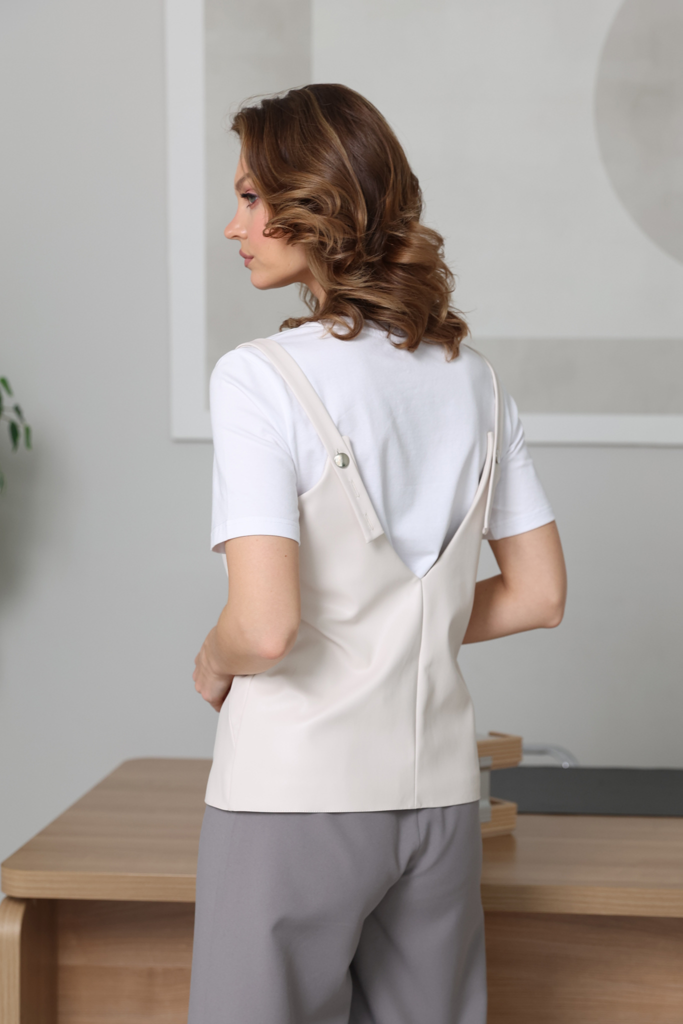 Топ из экокожи в бельевом стиле. V-образный вырез спереди и сзади изделия. Бретели регулируются по длине на спинке с помощью дополнительной петли для пуговицы.